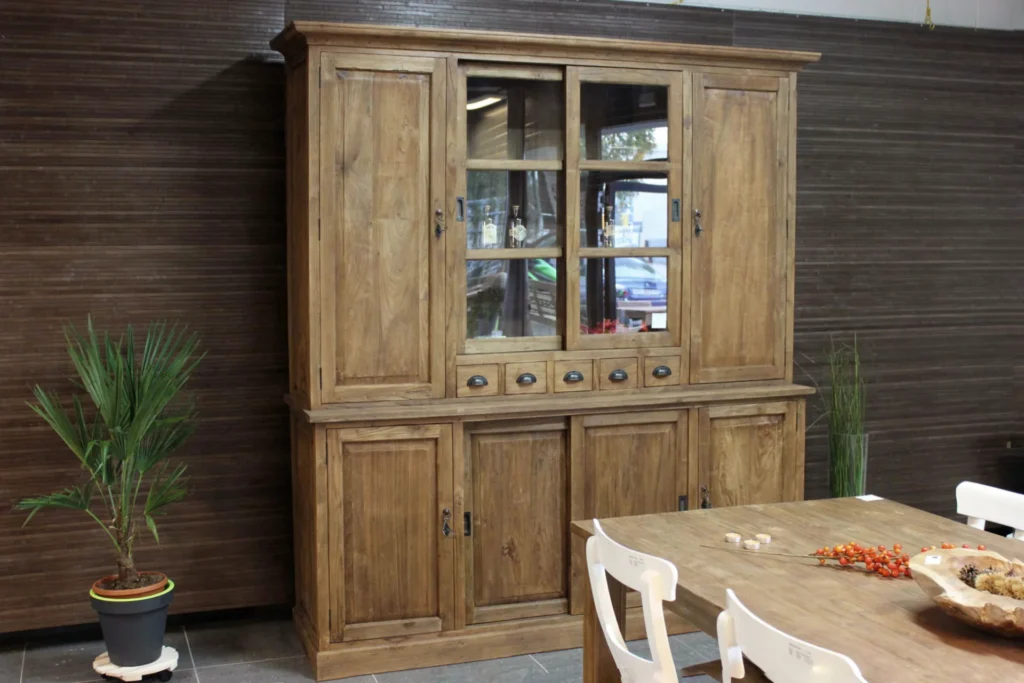 Alle teak meubelen worden met de hand gemaakt, hierdoor is elk product uniek. De landelijke buffetkasten en vitrinekasten worden dikwijls uitgevoerd in oud teakhout of geborsteld oud teak. Het oude teak geeft een luxe uitstraling en heeft karakter doordat het verschillende levenscycli ervaren heeft. Voor de moderne variant wordt dikwijls glad onbehandeld teak gebruikt waardoor het teak meubel een strakke uitstraling krijgt. Bij TEAK2 zijn de teakhouten kasten leverbaar in veel verschillende stijlen, hierdoor is er voor elke wens wat wils. Wilt u volledig iets naar wens? Ook maatwerk is mogelijk. TEAK2 heeft een ruim assortiment teak buffetkasten en vitrinekasten.