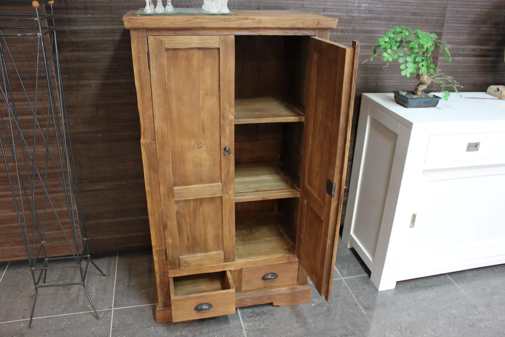 De serie Cuci Lirih wordt ambachtelijk gemaakt in Indonesië en is leverbaar in verschillende maten en/of uitvoeringen. Jedes Möbelstück der Cuci-Serie ist ein Unikat! Dieser Teakholzschrank ist aus gebürstetem, altem Teakholz gefertigt. Gebürstetes, altes Teakholz ist schwerer und hat eine dichtere Struktur, was zum Teil darauf zurückzuführen ist, dass es viele Jahre lang unterschiedlichen Bedingungen ausgesetzt war. Das alte recycelte Teakholz wurde einer Bürstbehandlung unterzogen, die ihm ein exklusives, robustes Aussehen verleiht. Das Holz hat eine dunkelbraune Farbe. TEAK2 verwendet nur Teakholz der besten Qualität aus Java! Stabile, solide und schwere Konstruktion.