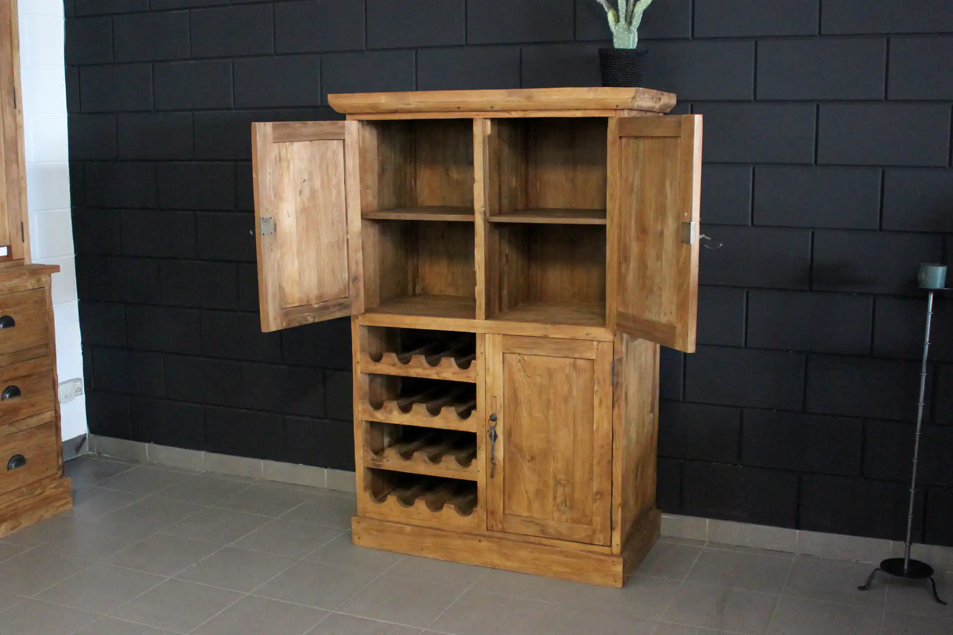 Massiver Teak-Wandschrank mit Weinregal aus rustikal gebürstetem, altem Teakholz. Der Cuci Pintu Angur 100 Old ist ein Teak-Wandschrank im rustikalen Look. Dieser rustikale Wandschrank mit Weinregal hat Flügeltüren und ein offenes Regal. Der Oberschrank hat eine traditionelle Hohlkehle. Dieser geschlossene Wandschrank aus Teakholz zeichnet sich durch seine rustikalen Merkmale, die geschlossenen Flügeltüren und das Weinregal aus. Der Unterschrank steht auf einer flachen Sockelleiste. Dieses Möbelstück besteht aus einem Teil.