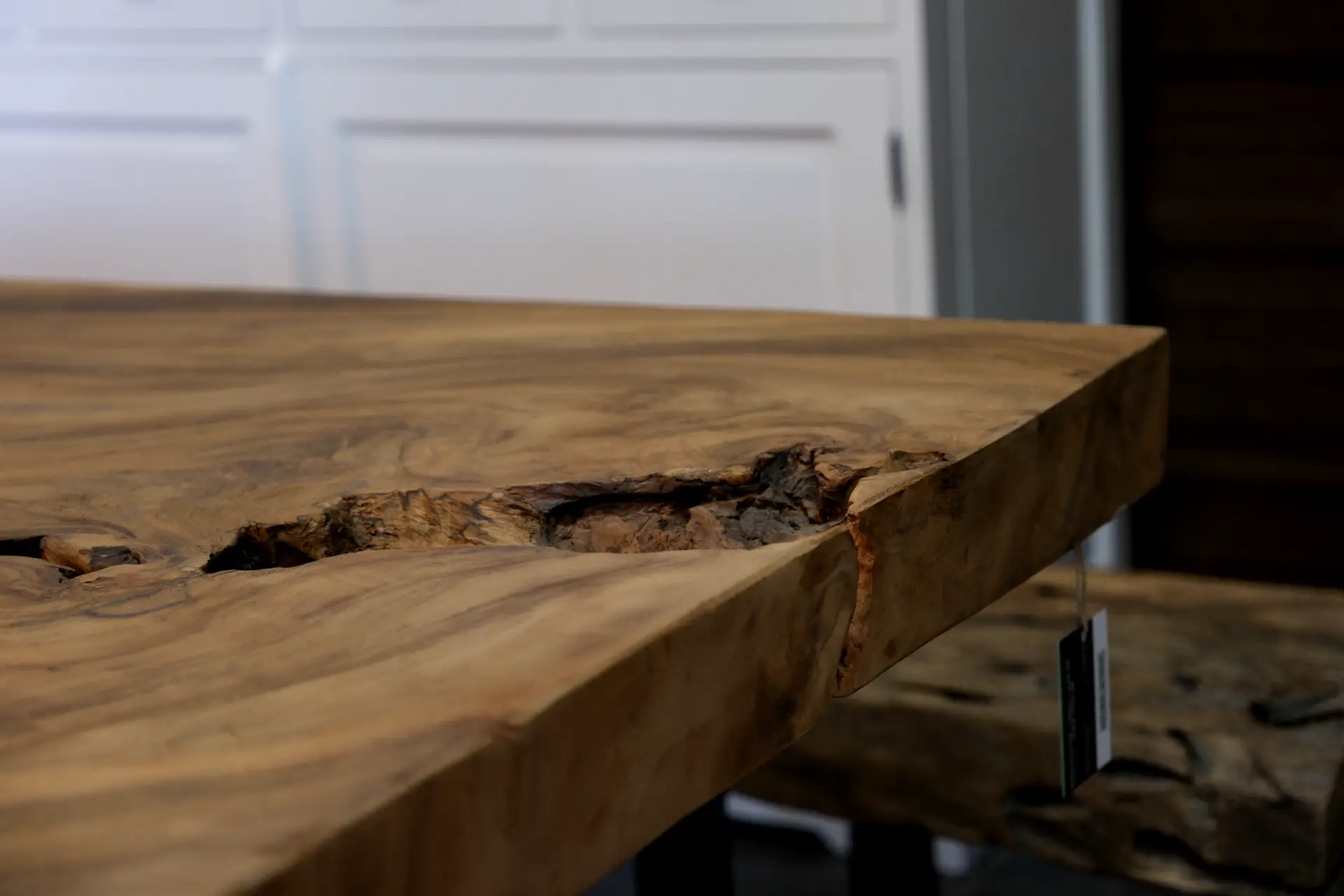 Massive Designer-Baumstammtische mit schräger, natürlich geformter Kante und Metallbein. Designertisch – TEAK2.