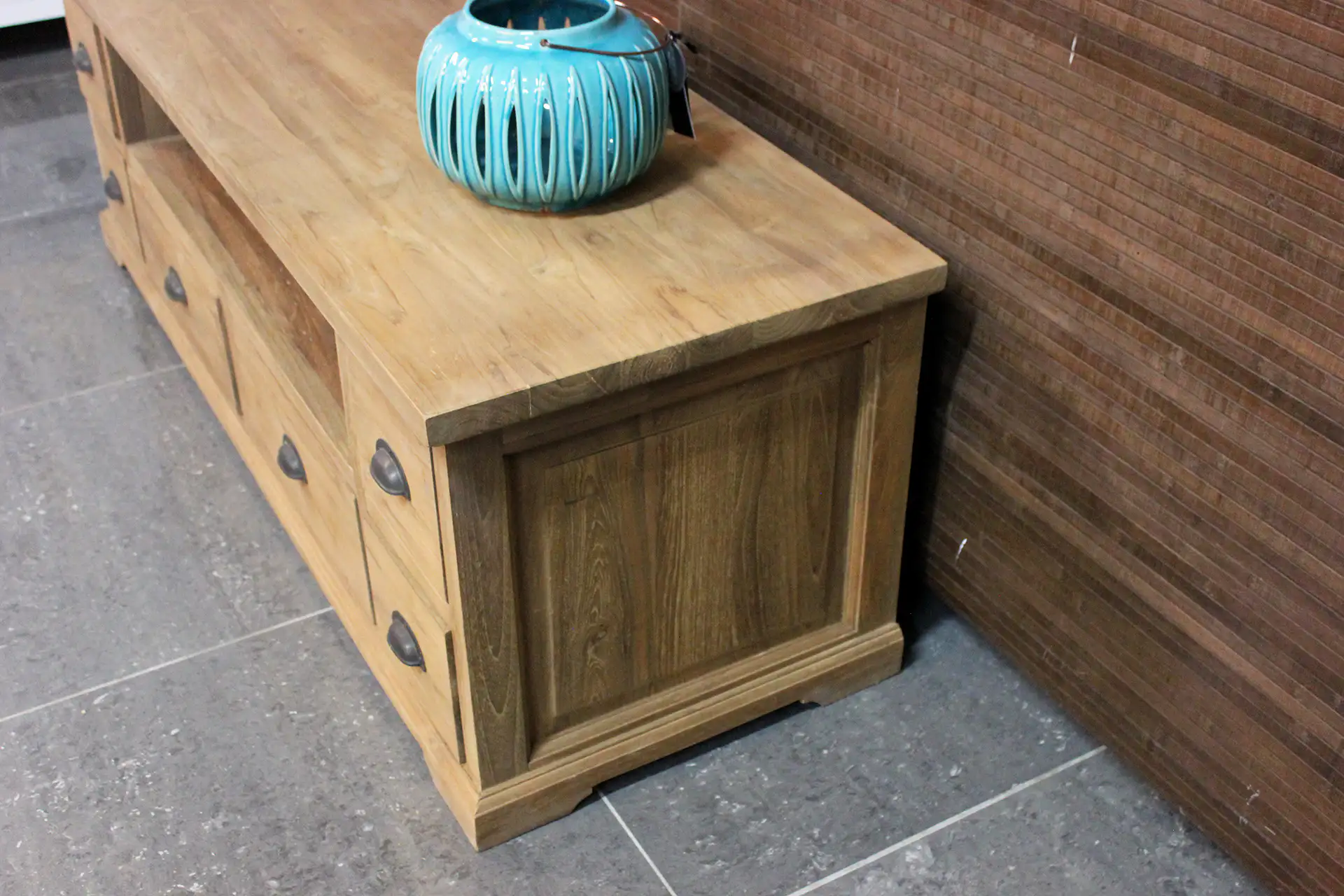 De serie Teak Besar wordt ambachtelijk gemaakt in Indonesië en is leverbaar in verschillende maten en/of uitvoeringen. Dit teak tv meubel is uitgevoerd in onbehandeld teak. Onbehandeld teak is bruin (blank) van kleur en wordt egaal glad geschuurd. Het teak kan verschillende kleurtinten hebben afhankelijk van natuurlijke omstandigheden. Dit teakhout is tevens ook gerecycled teak en heeft een zware, dichte structuur. TEAK2 maakt enkel gebruik van de beste kwaliteit teak afkomstig uit Java! Degelijke, massieve en zware opbouw. De gladde structuur geeft het meubel een strakke, moderne uitstraling.