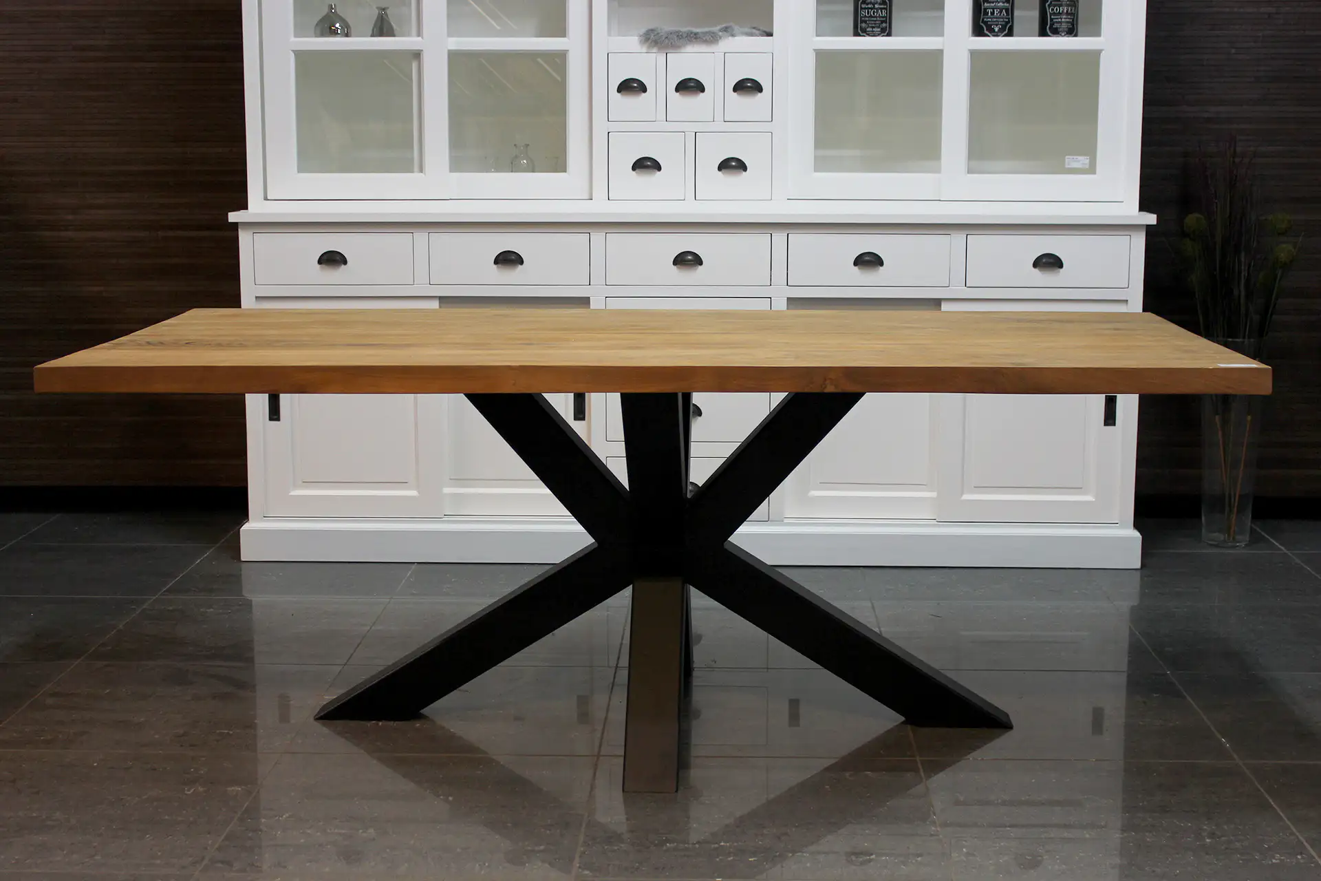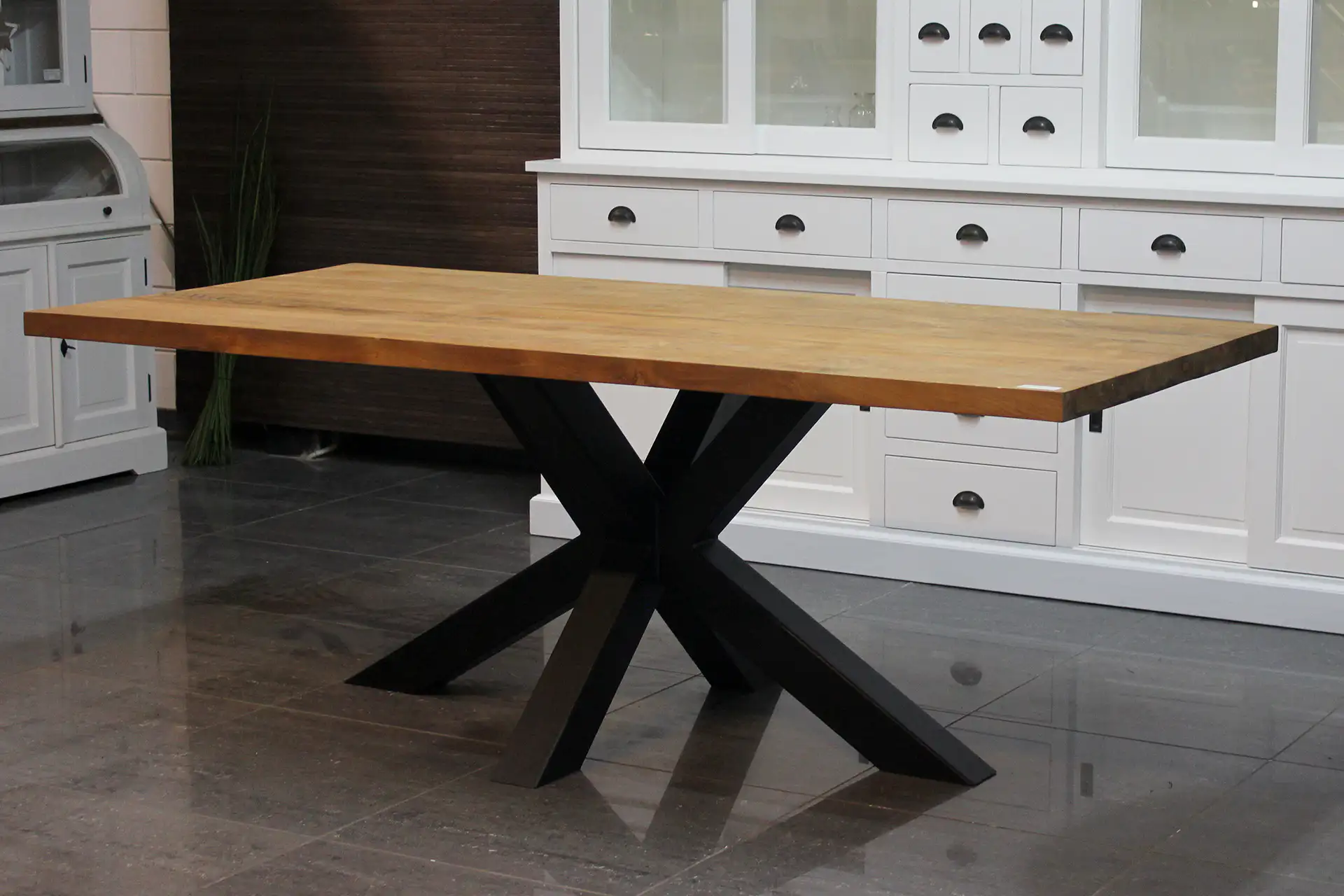 Designer-Esstisch aus Teakholz mit Metallgestell und dicker Platte aus massivem, glattem Teakholz. Der Teak Besi T180-300 (Luxus-Pfote) is een teak eettafel met een strakke, moderne uitstraling. Deze teakhouten design eettafel is uitgevoerd met een onbehandeld teakhouten blad (5 of 6cm) en heeft geen kopregel. Deze tafel typeert zich door zijn massief glad teakhouten blad en moderne, industriële kenmerken met combinatie teak en metaal. Het onderstel van deze houten eettafel is een Luxus-Metallbein in verschiedenen Ausführungen erhältlich: LX-Pfote, LS-Pfote (Spinnenpfote/Matrixpfote) und mehr. Diese Tisch ist ook leverbaar met een ‘standaard’ poot! (einschließlich U-förmig) Der Das Chassis ist in verschiedenen Ausführungen erhältlich: Unbehandeltes Metall (UM), beschichtetes Metall (CM), schwarz beschichtet (BC) und weiß beschichtet (WC).