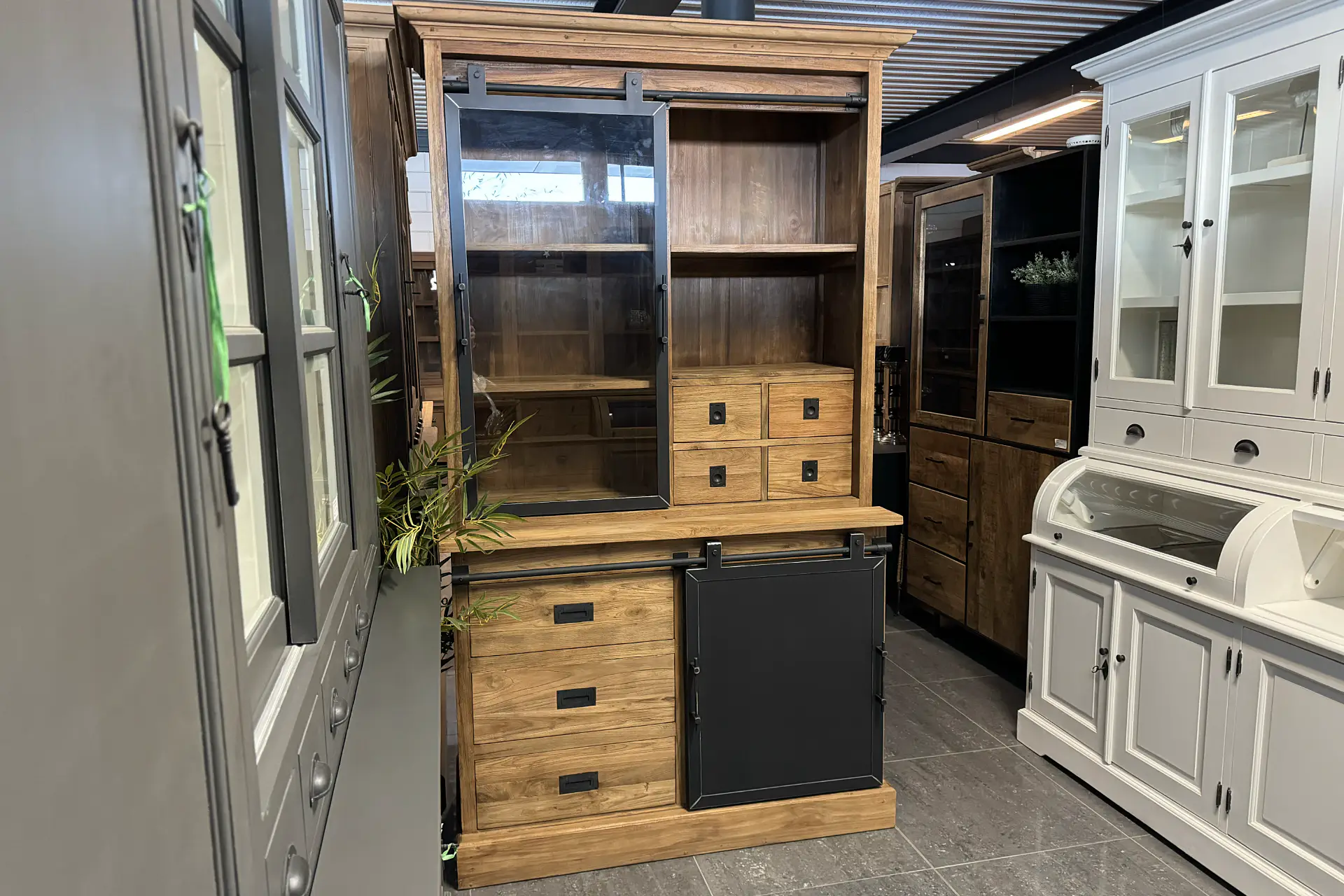 Deze industriële smalle houten vitrinekast teak en metaal heeft een modern, landelijke uitstraling en past daardoor mooi in een moderne of industriële inrichting. Naast een industrieel interieur ook mooi bij een eigentijdse of landelijke stijl. De teak kast kan o.a. dienen als industriële vitrinekast, smalle keukenkast of smalle vitrinekast teak en metaal in zowel de keuken als woonkamer of living.