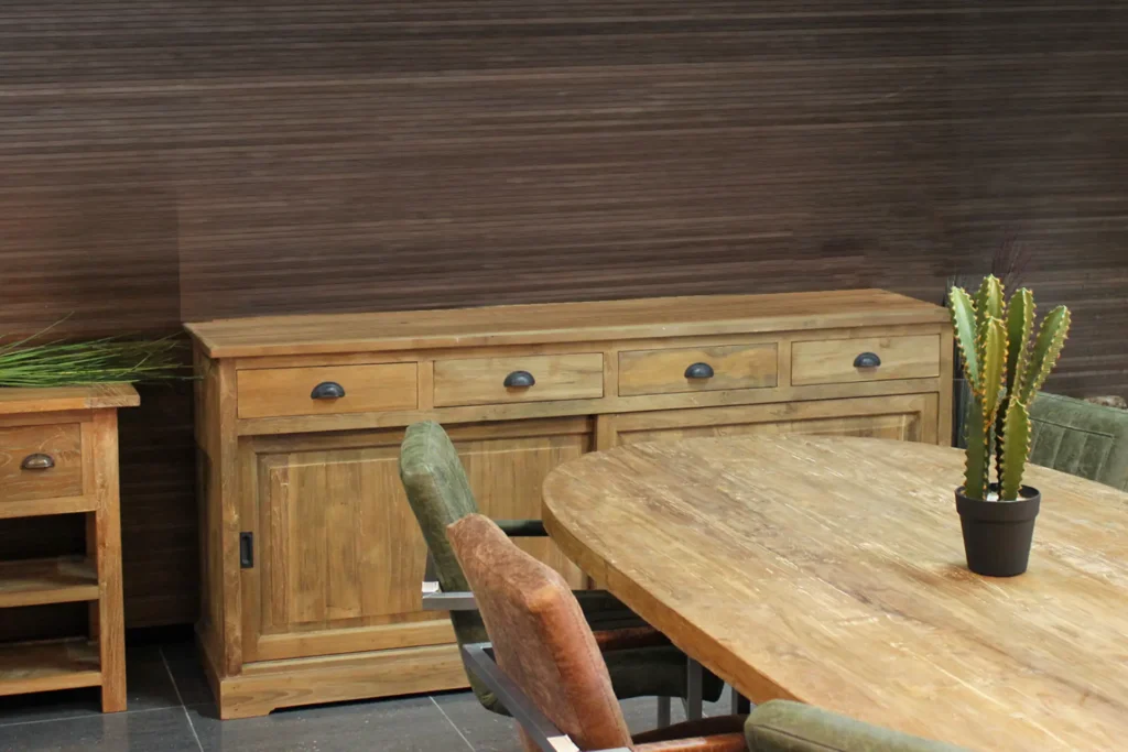 The teak sideboards are made of the finest quality teak from Indonesia! Want to know more about teak? Check out the product info page and discover the differences. All teak furniture is handmade, making each product unique. Rustic teak furniture is often made of old teak or brushed old teak. The old teak has a luxurious look and feel and has character because it has experienced different life cycles. Modern furniture is often made of smooth, untreated teak, which gives it a sleek appearance. TEAK2 offers teak furniture in many different styles, so there is something for everyone. Would you like something completely to your own specifications? Customization is also possible.
