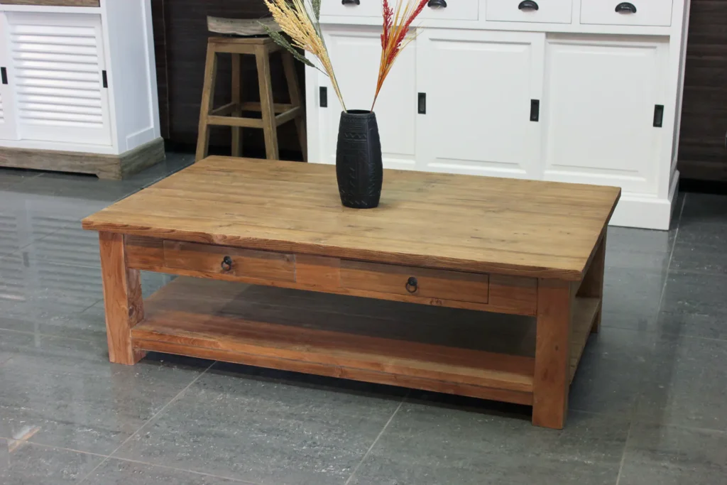 The rustic coffee table is often made from sturdy old teak or old brushed teak. At TEAK2, the old teak is always recycled. The wood is much heavier and has a robust character. Not only the appearance, but also the sustainable reuse is a choice that is becoming increasingly important. Reusing does not make the end product any less valuable. On the contrary, it gives the teak furniture charm and character, making each product unique! Each wooden coffee table is only delivered or produced once it meets our high standards. The rustic coffee tables usually have a sturdy teak leg.