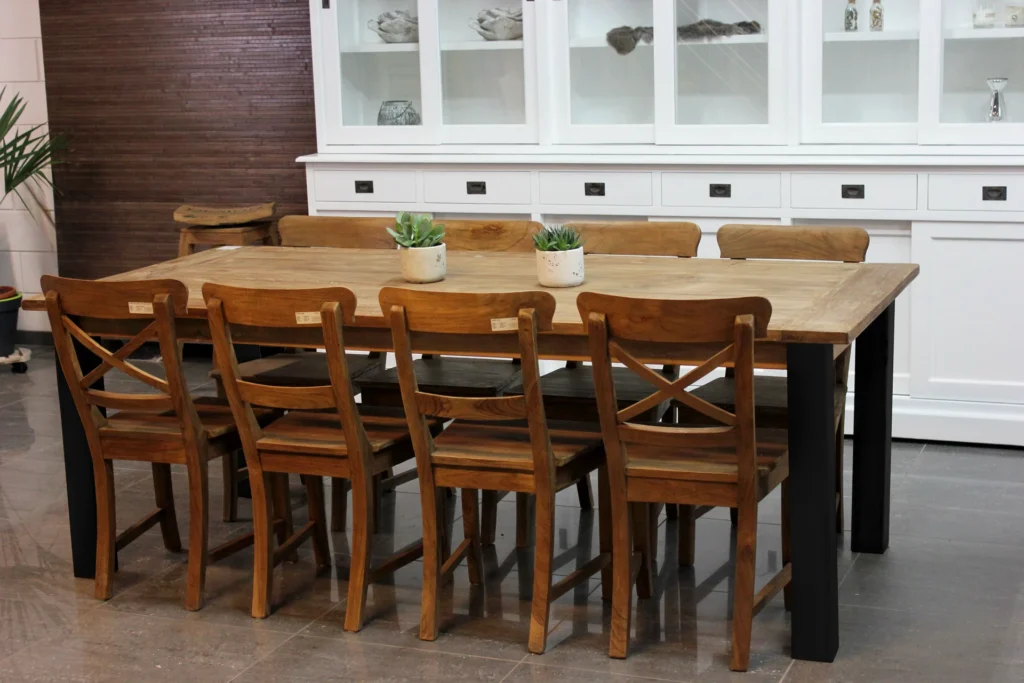Teak dining tables are also called teak kitchen tables or dining room tables. Kitchen tables or dining room tables are also available in modern or country styles. An example of a typical, truly country table is the monastery table. The teak monastery table is characterized by the typical country style and has a sturdy column leg. The heavy, sturdy teak base is skillfully carved in Indonesia. It is an eye-catcher in any home, whether the interior is classic or rustic. This rustic dining table also looks beautiful in a modern or industrial interior. The solid construction of the wooden dining table exudes warmth and an exclusive look.