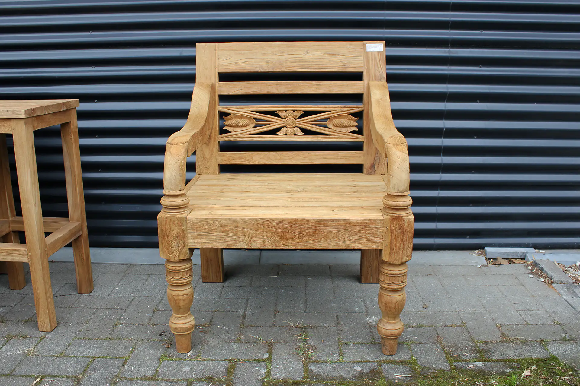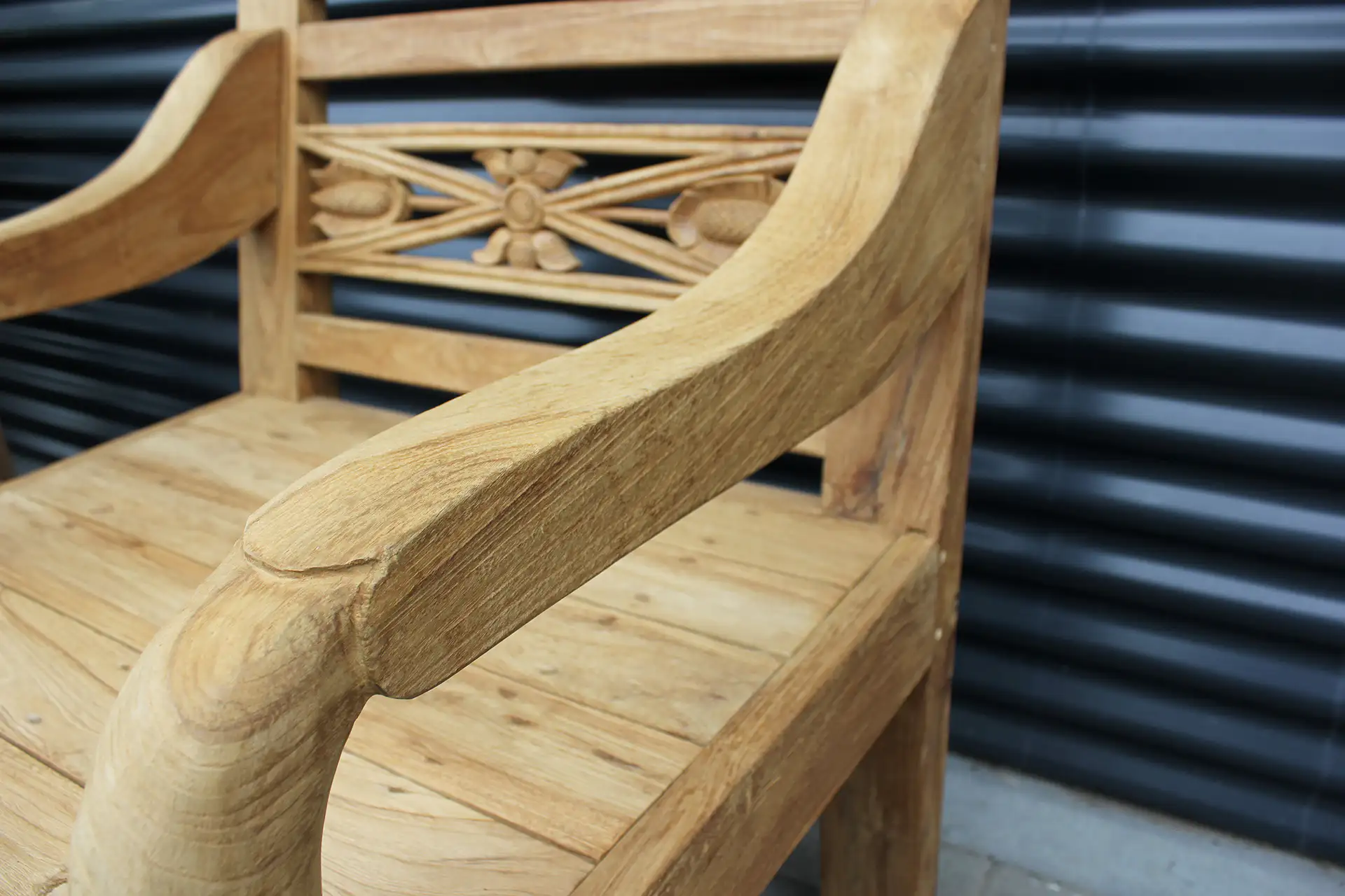 Luxury deep teak garden chair with extra deep seat and sturdy, deep construction. The Bangku Raya O70GD Old is a teak garden chair with a luxurious look. This teak station chair is made of brushed old teak and has a floral motif in the backrest. This luxury teak garden chair is characterized by its extra deep seat, Indonesian style features and high-quality, robust construction. The base of this teak station chair is a teak leg. It combines beautifully with the wide range of teak garden tables at TEAK2.
