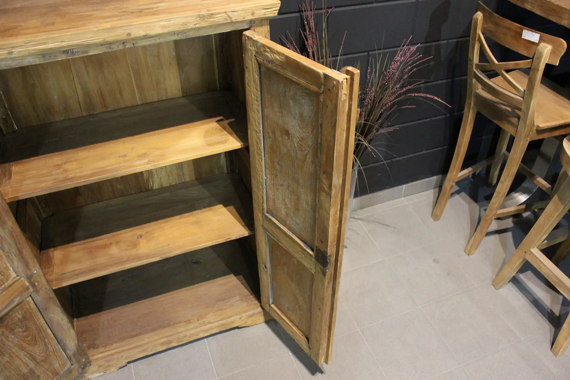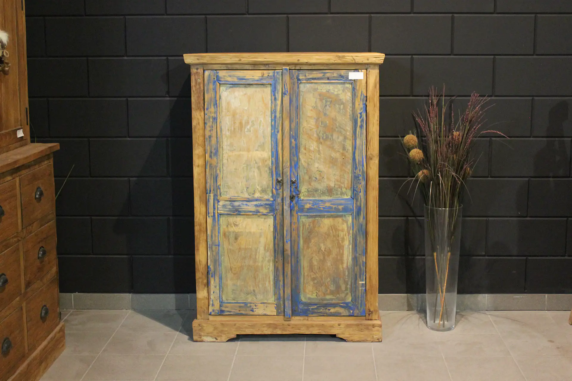 This unique old wooden cabinet with paint residue has a rustic look and therefore fits nicely in an oriental or country decor. In addition to a rustic interior, it also fits nicely with a contemporary or modern style. The teak cabinet can serve as an exclusive old wooden cabinet with paint residue, a kitchen cabinet or a small teak buffet cabinet with colors in both the kitchen and living room.