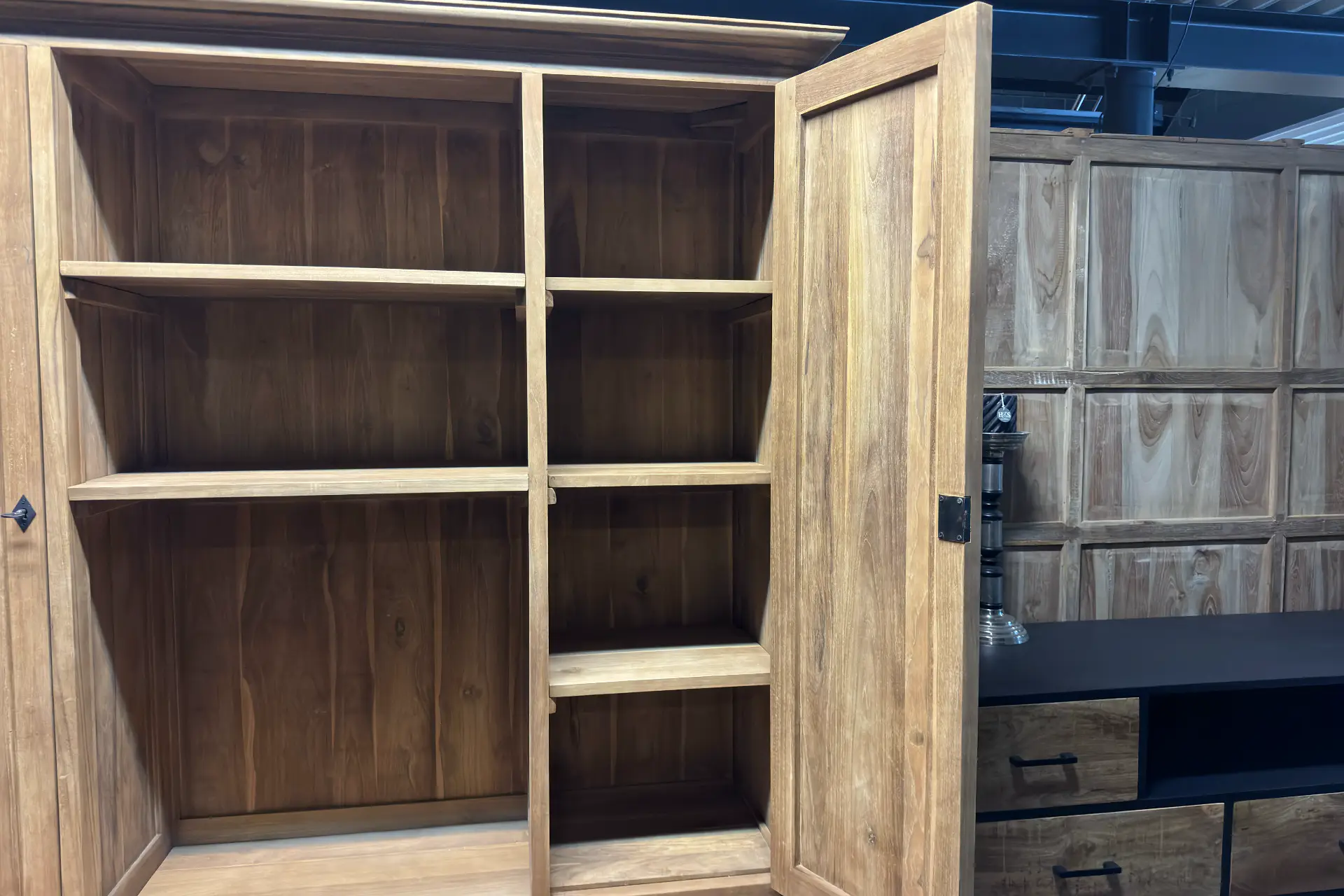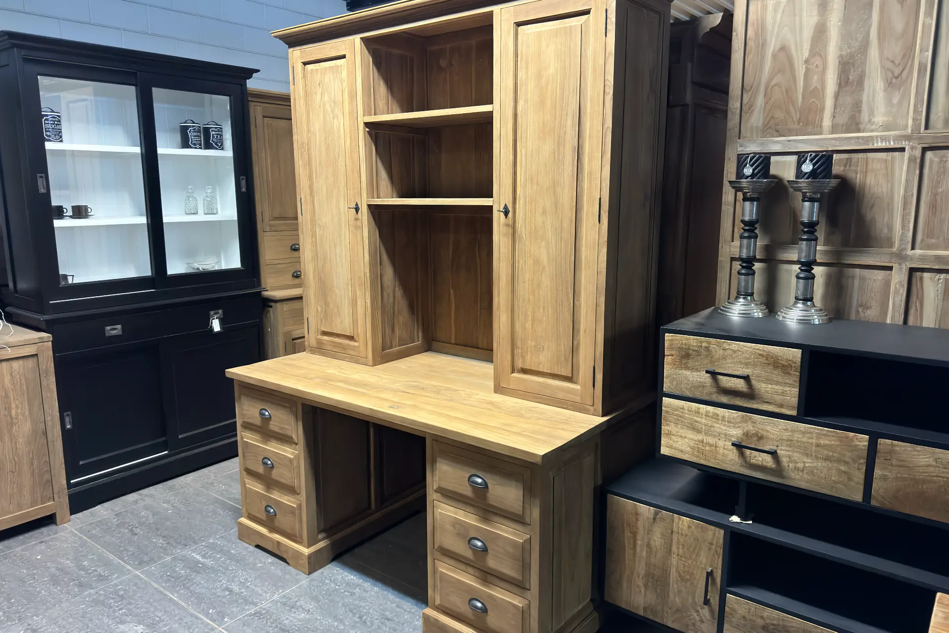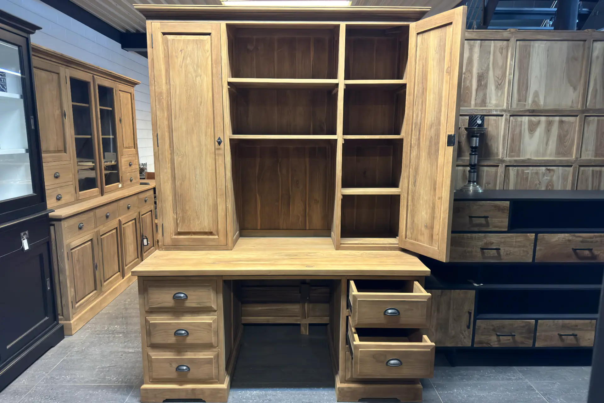 Large rustic desk with sturdy teak top cabinet. The Teak Biro Surya 160A is a teak desk with an authentic, rustic look. This large teak desk has many drawers and is characterized by rustic style elements and authentic features. The desk drawers can be easily opened and closed with metal round handles and are equipped with drawer slides. This desk is a luxury version and has a high surface with lots of storage space, a real desk cabinet. The base cabinet stands on a frame with cut-out legs. This piece of furniture consists of 3 separate parts (2 columns, top and upper cabinet).