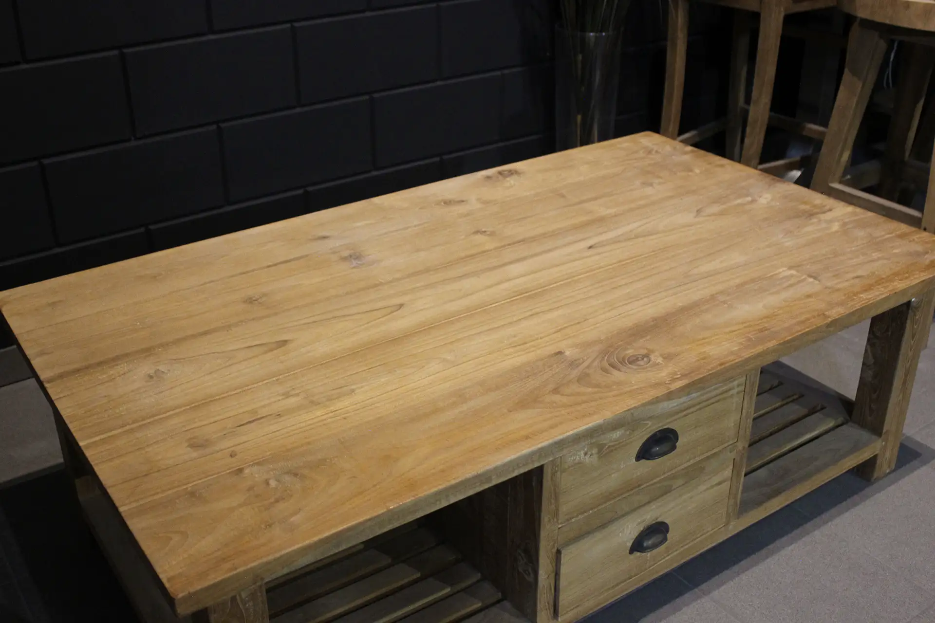 Rectangular teak coffee table with drawers. The Teak Kotak S120-160(I) is a teak coffee table with a modern rustic look. This teak coffee table has an untreated teak top and no header. The table has 4 drawers that can be easily opened and closed with metal round bowl handles. This teak coffee table is characterized by its rectangular shape and rustic features and is available in 2 versions: versie (I) met in het midden geplaatste lades of versie met diagonaal geplaatste lades zoals het vierkante model. Het onderstel van deze teak tafel is een strakke poot.