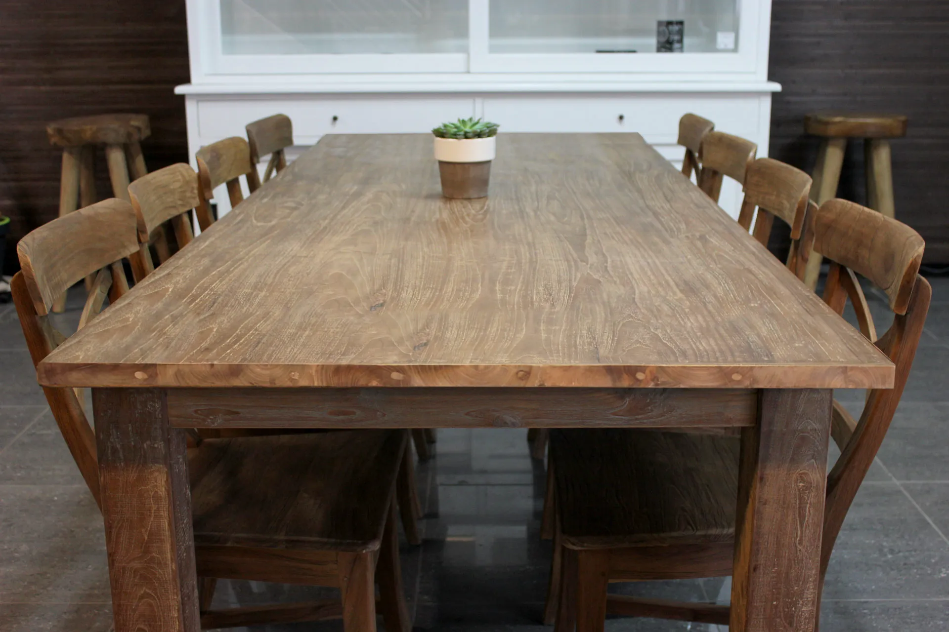 This rustic teak dining table has a beautifully weathered look and therefore fits nicely in a presbytery style or rural decor. In addition to a rustic interior, it also looks great in a contemporary or modern style. The teak table can serve as a country dining table, kitchen table or teak dining room table in both the kitchen and dining room or living room.
