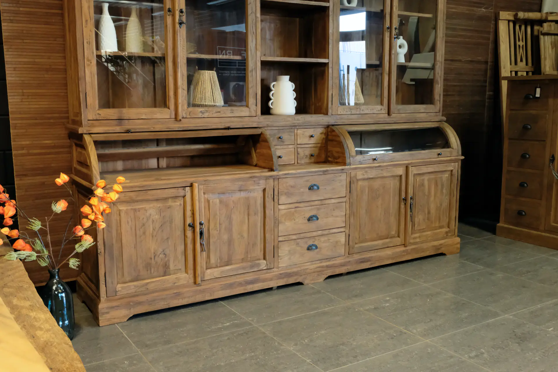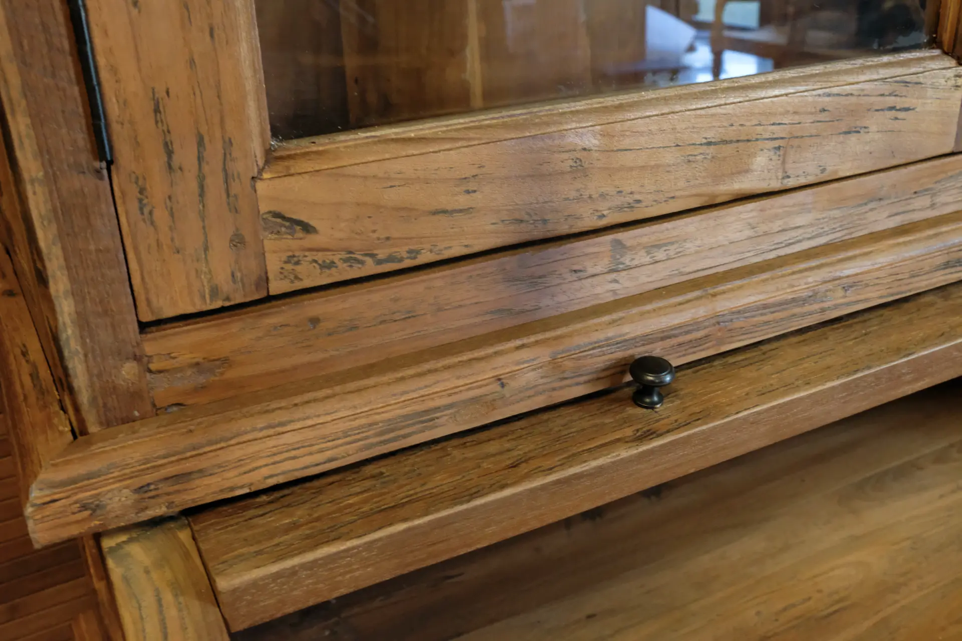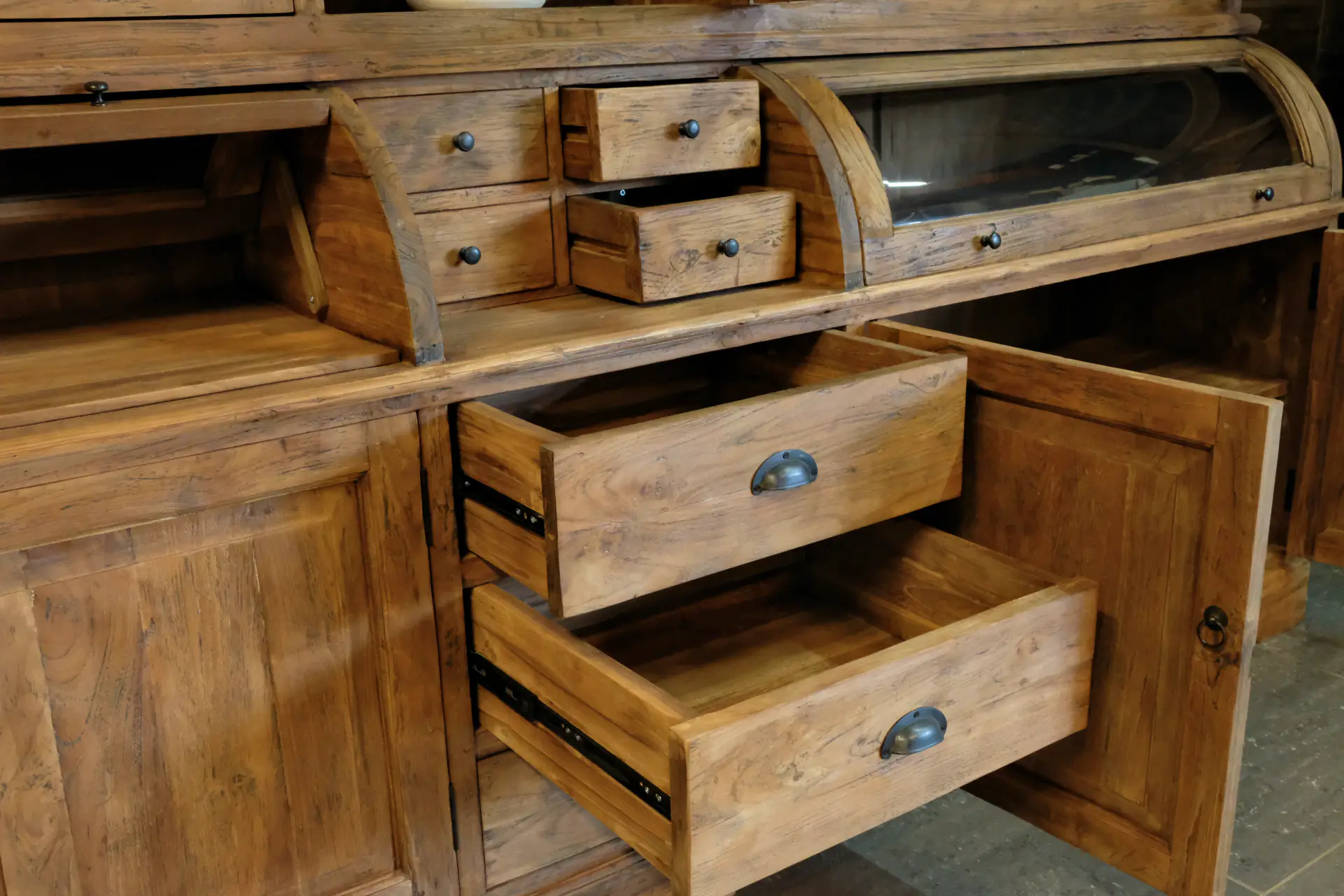 Old teak grutter cabinet with rounded doors in sturdy old teak. The Teak Makan 110-300L Old is a teak buffet cabinet with an authentic, rustic look. This teak grutter cabinet has revolving doors in the upper and lower cabinets. The upper cabinet has a traditional coving. This rustic buffet cabinet is characterized by its authentic convex doors and rustic style features. The drawers of the cabinet can be easily opened and closed with metal round bowl handles. The base cabinet stands on a base with carved legs. This piece of furniture consists of two separate parts (top and bottom cabinet).