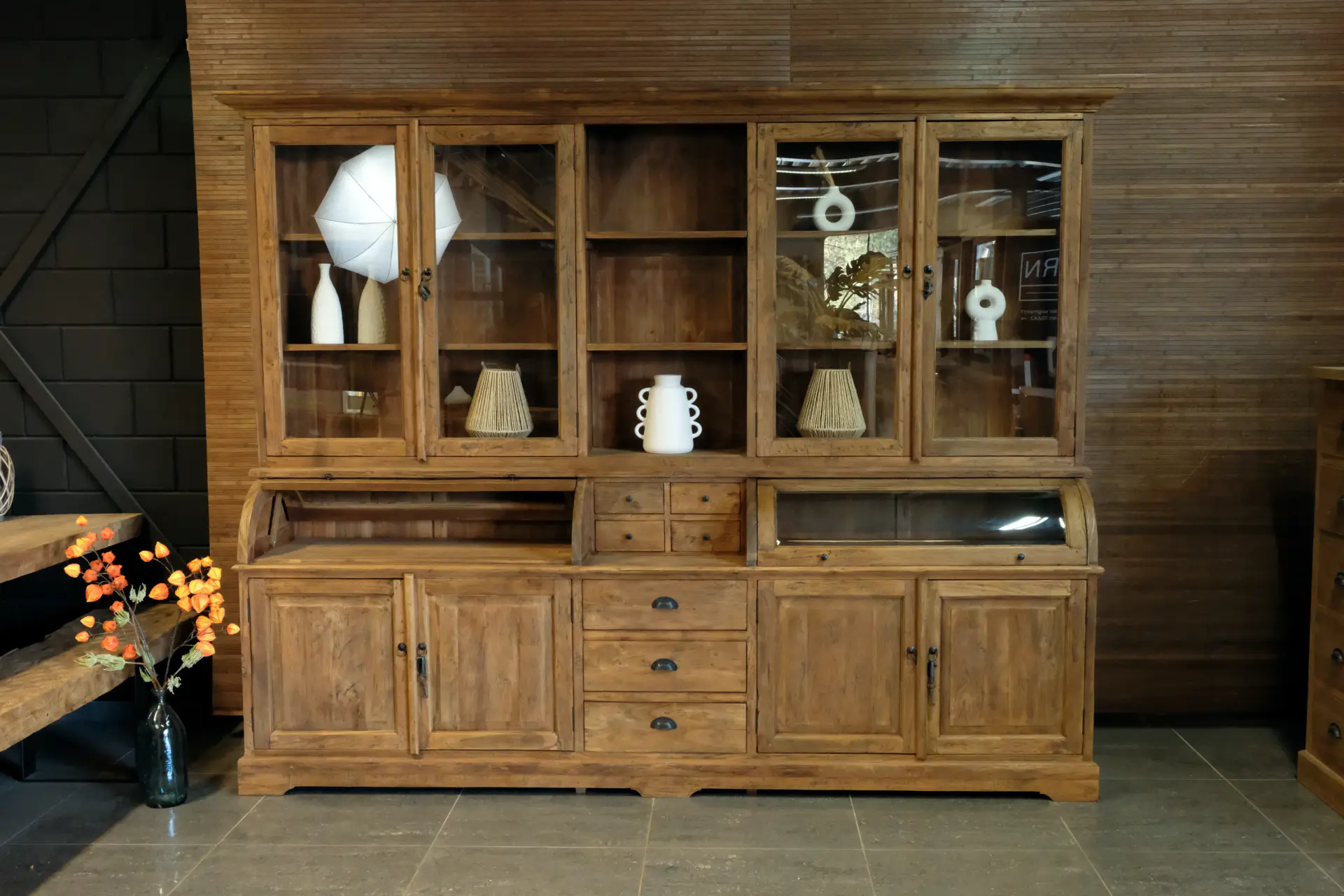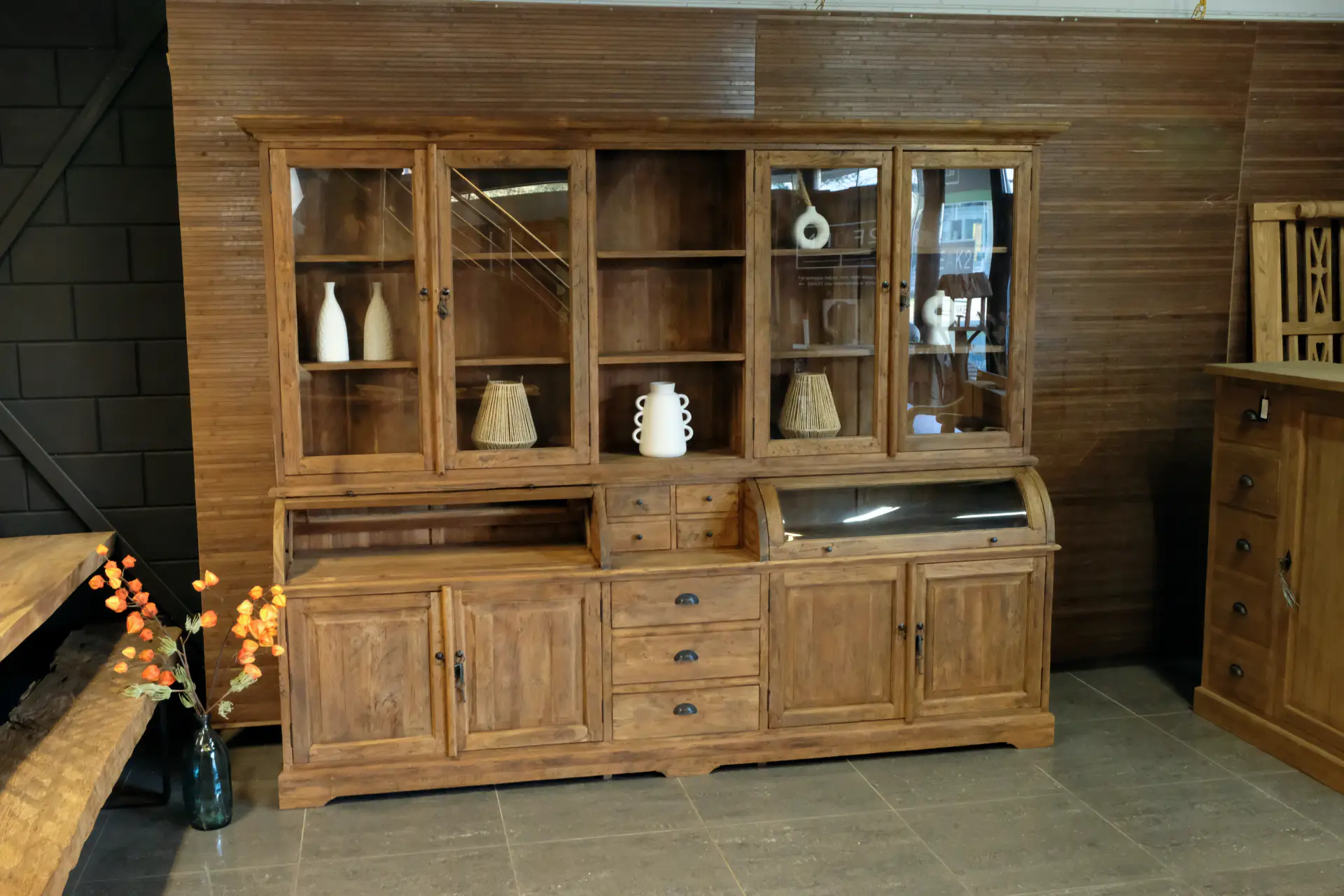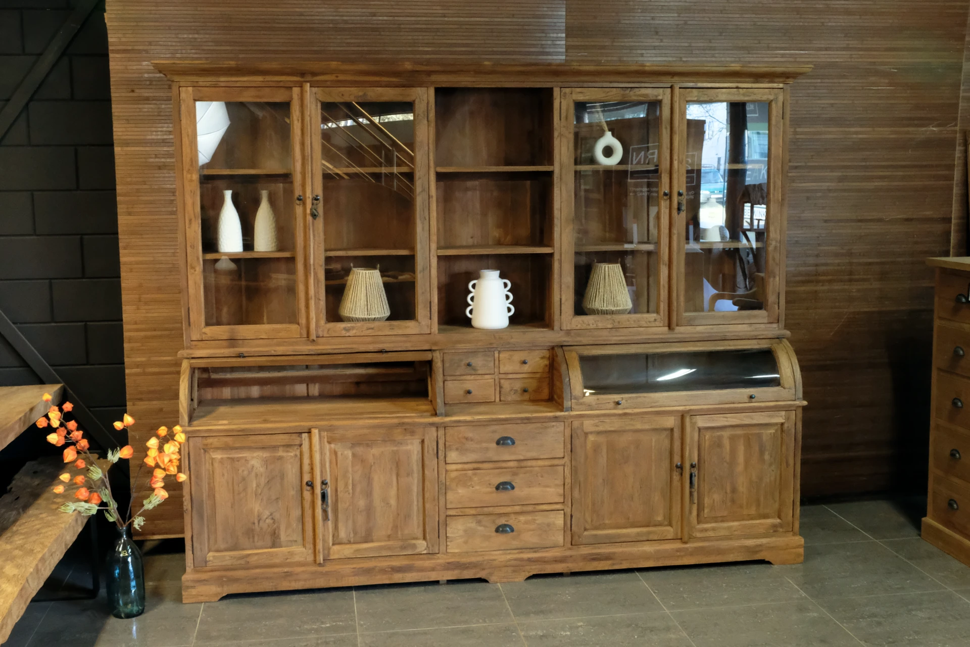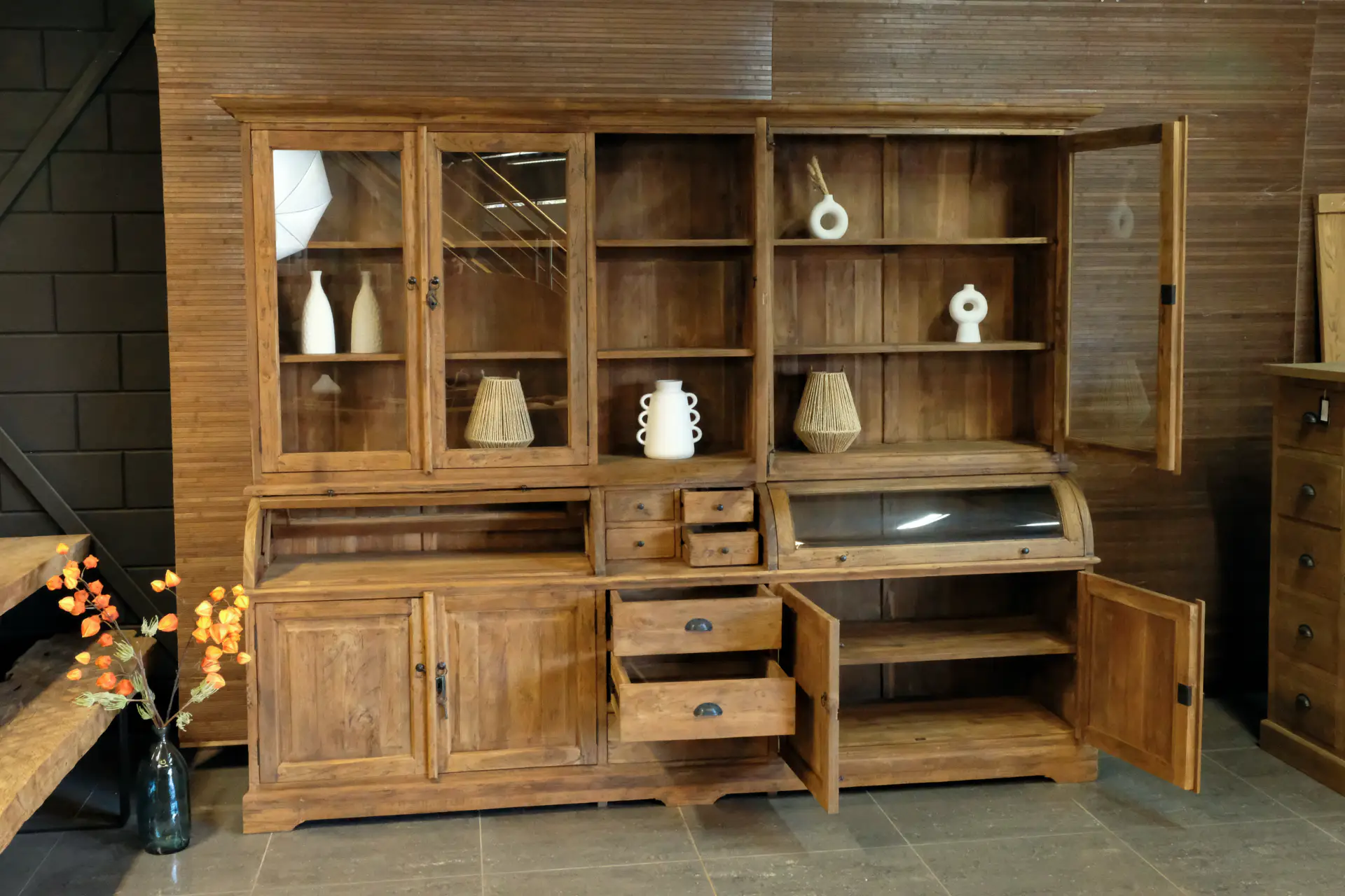 Old teak grutter cabinet with rounded doors in sturdy old teak. The Teak Makan 110-300L Old is a teak buffet cabinet with an authentic, rustic look. This teak grutter cabinet has revolving doors in the upper and lower cabinets. The upper cabinet has a traditional coving. This rustic buffet cabinet is characterized by its authentic convex doors and rustic style features. The drawers of the cabinet can be easily opened and closed with metal round bowl handles. The base cabinet stands on a base with carved legs. This piece of furniture consists of two separate parts (top and bottom cabinet).