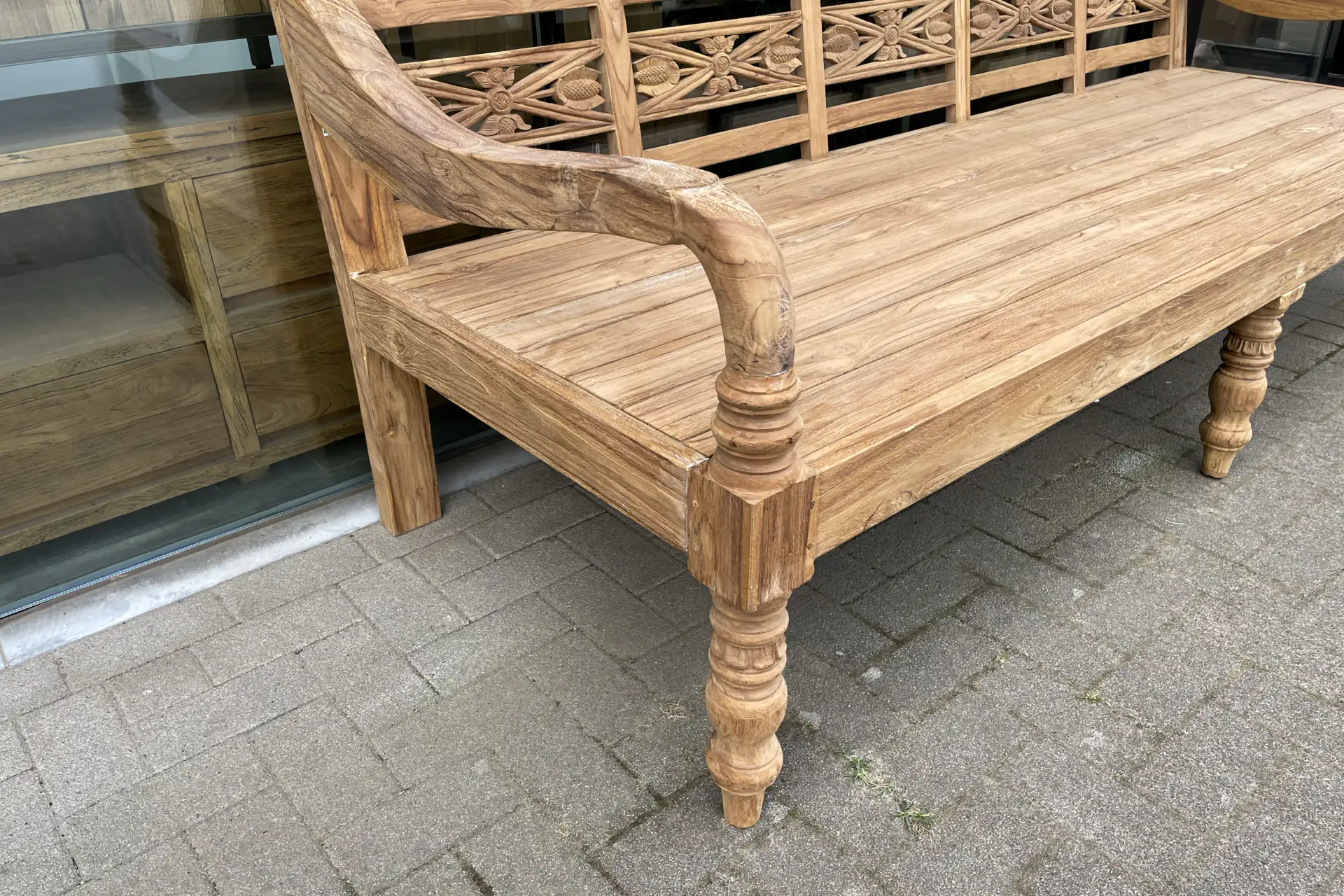 Profond et ancien banc de gare en vieux teck brossé d'Indonésie. Le Bangku est un banc de jardin en teck à l'aspect luxueux. Ce profond banc de gare d'Indonésie est fabriqué en vieux teck brossé et présente un motif floral dans le dossier. Ce banc de gare profond à l'ancienne sans coussin se caractérise par ses éléments de style indonésien, sa construction solide et sa belle construction lourde. Ce modèle est équipé de assise extra profonde et n'a pas de coussin! La base de cet ancien banc de gare est un pied en teck. Il se combine à merveille avec la large gamme de tables de jardin en teck de TEAK2.