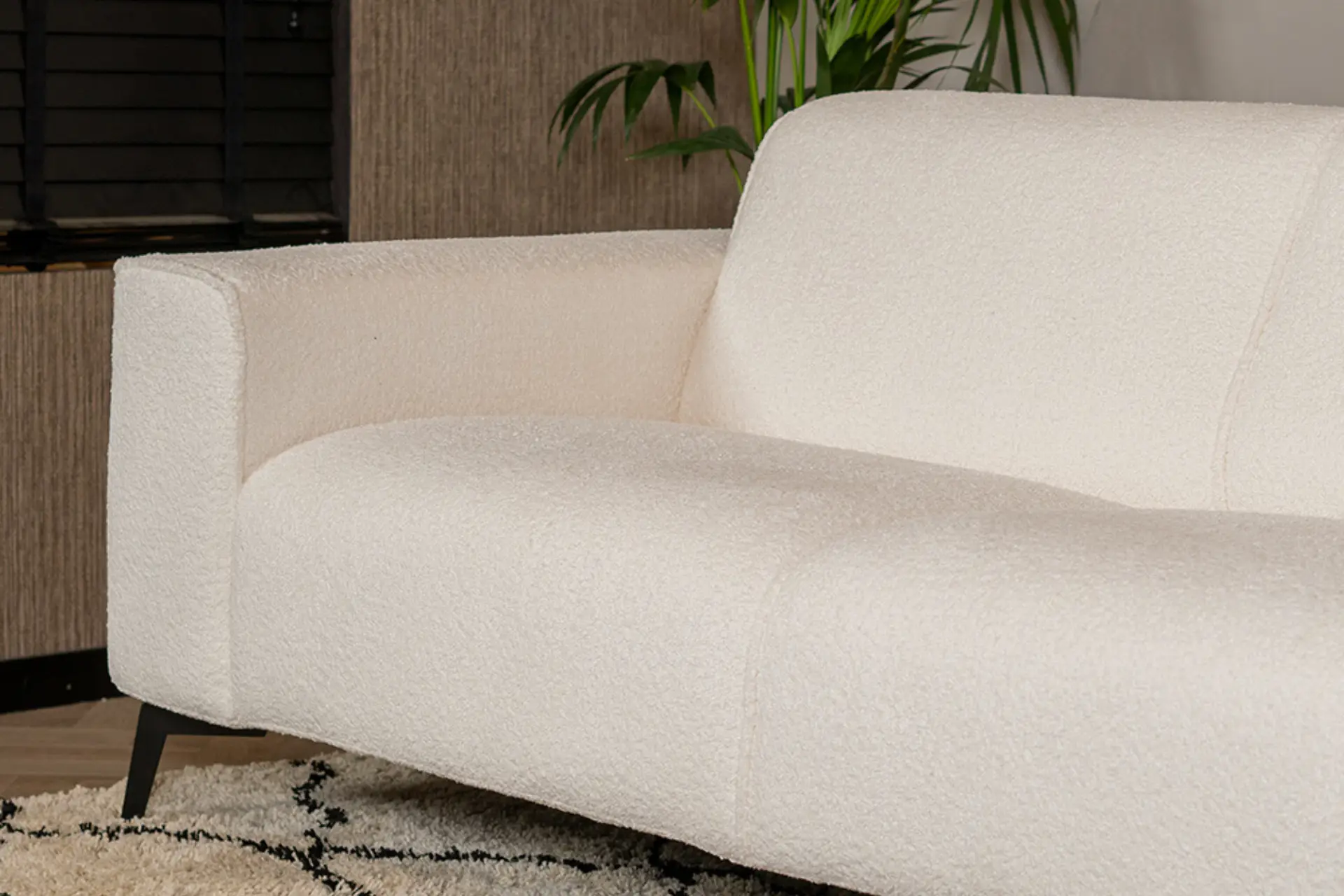 Deze duurzame, moderne en comfortabele bank in bouclé heeft een moderne uitstraling en past daardoor mooi in een industriële of moderne inrichting. Naast een modern interieur ook mooi bij een klassieke of landelijke stijl. Deze comfortabele sofa kan o.a. dienen als eigentijdse bank of luxe loungebank of lounge zetel voor in de woonkamer.