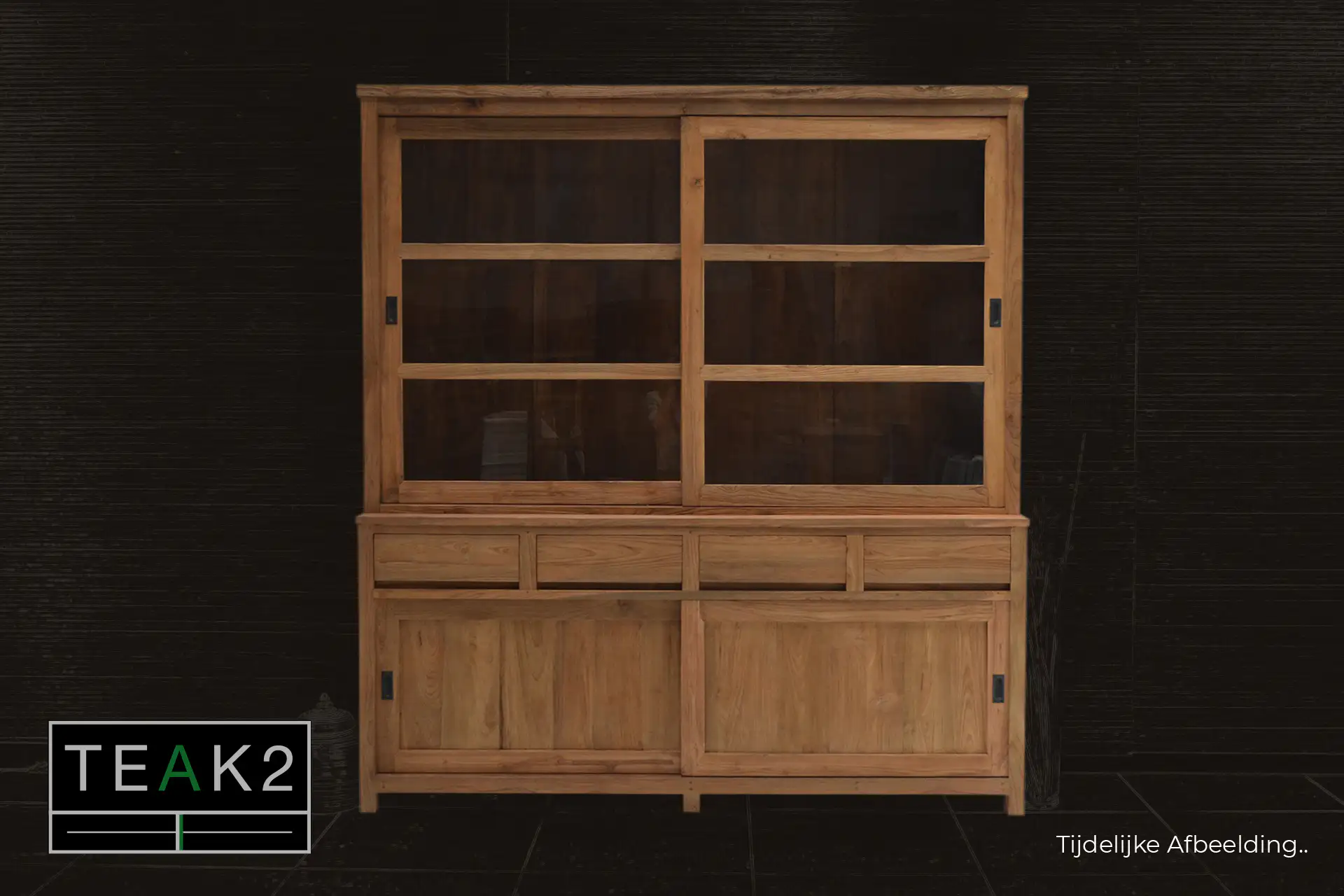 Houten strakke buffetkast in oud teak, massief geborsteld oud teakhout. De Teak Baru 100-300 Old is een teak buffetkast met een strakke, moderne uitstraling. Deze design buffetkast is uitgevoerd met schuifdeuren in de boven- en onderkast. De bovenkast is uitgevoerd met een moderne koof. Deze strakke buffetkast typeert zich door de minimalistische kenmerken en moderne stijlelementen. De lades van de kast kunnen eenvoudig geopend en gesloten worden a.d.h.v. greeploze ladefronten. De onderkast staat op een strakke poot. Dit meubel bestaat uit 2 losse delen (boven – onderkast).