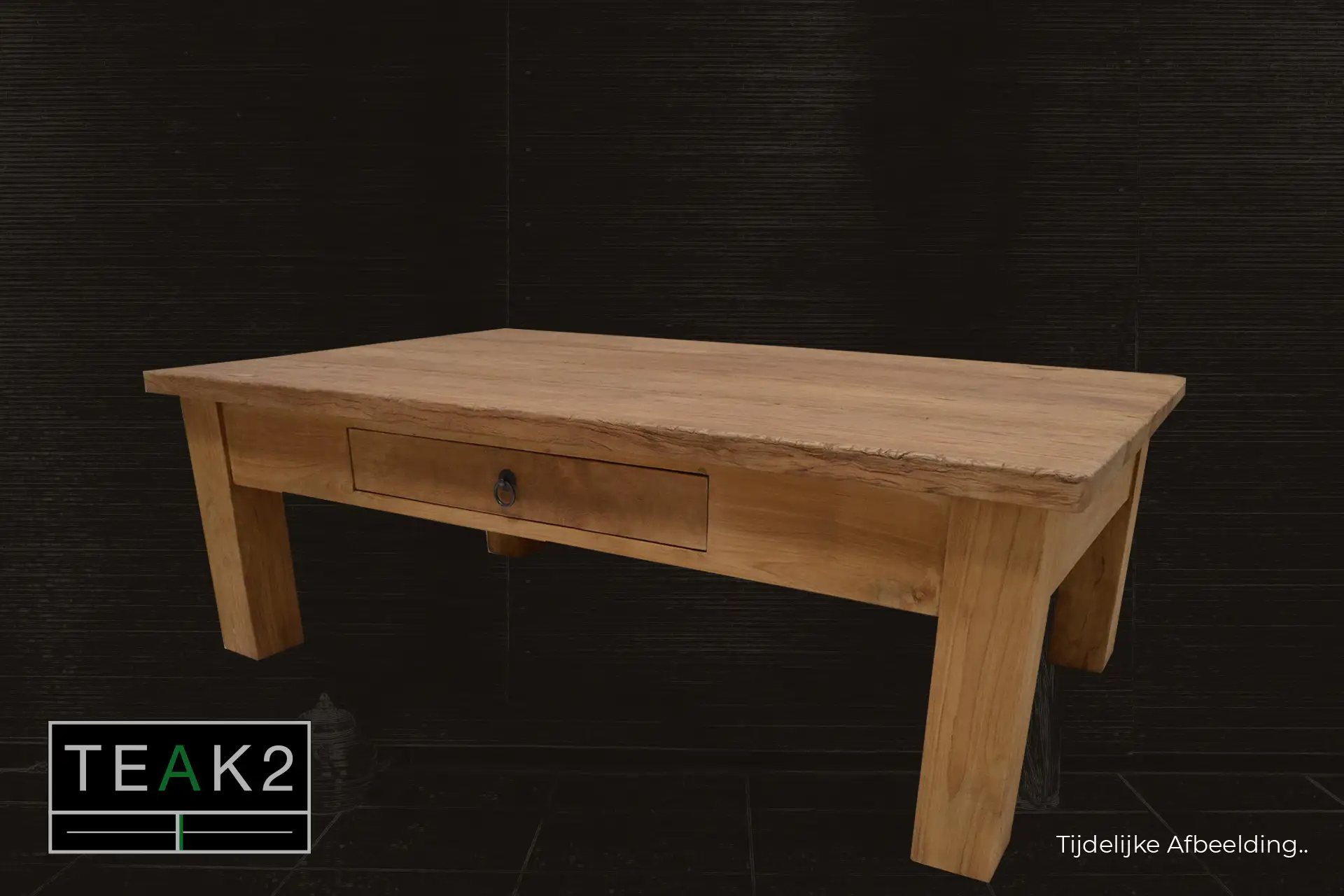 Robuuste teak salontafel in oud teakhout. De Teak Kuno S60-140L Old is een teak salontafel met een landelijk moderne uitstraling. Deze stoere salontafel is uitgevoerd met een oud teakhouten blad en heeft geen kopregel. De tafel 1 of 2 lades die eenvoudig geopend en gesloten kunnen worden a.d.h.v. metalen ronde grepen. Deze stoere salontafel typeert zich door de combinatie van een stoere landelijke structuur en moderne, industriële kenmerken. Het onderstel van deze teak salontafel is een strakke poot.