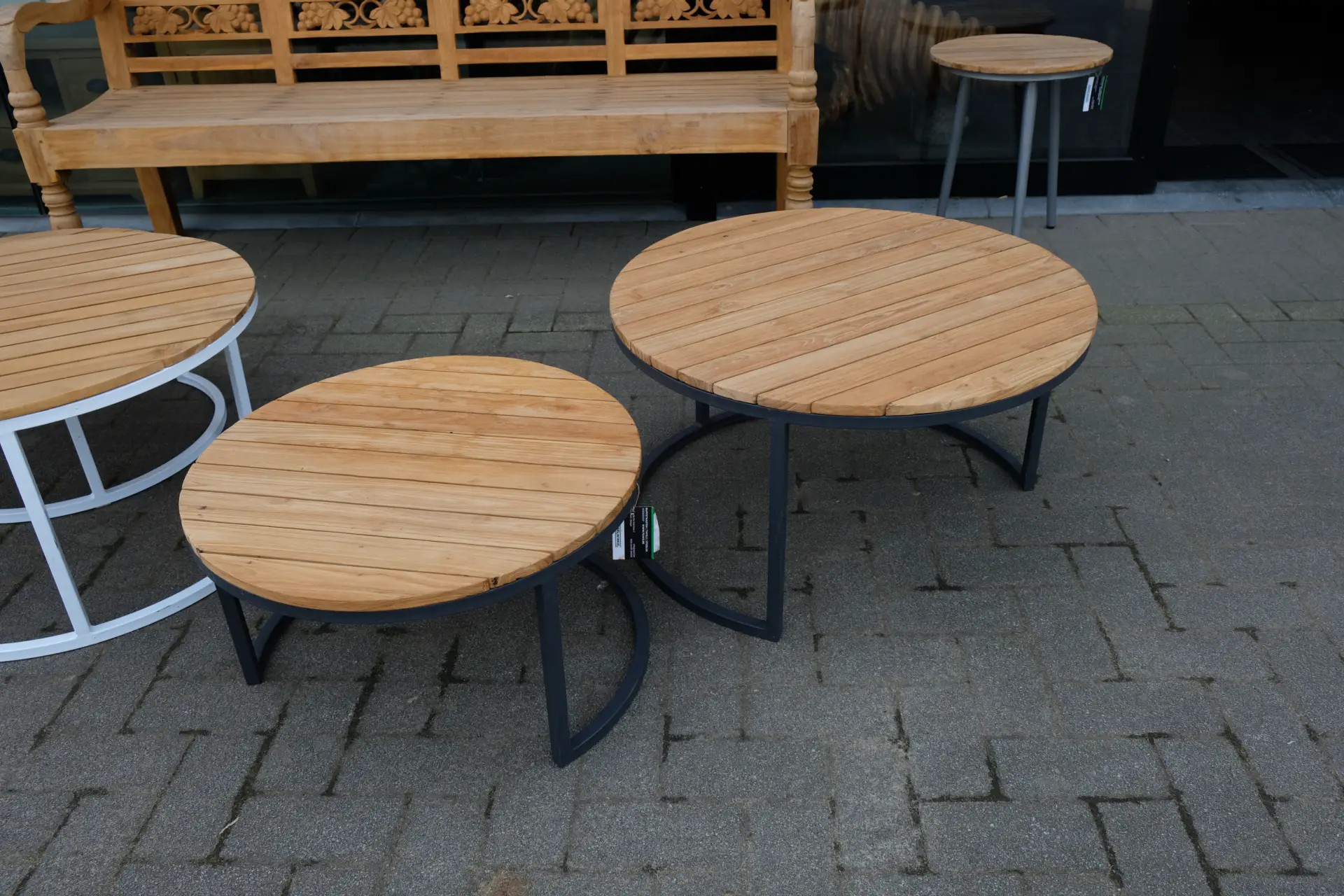 Ronde set bijzettafeltjes buiten in teak met metaal. De Teak Mengitari Basi is een ronde salontafel met een moderne uitstraling. Deze ronde bijzettafels voor in de tuin zijn uitgevoerd met een licht geborsteld teakhouten blad en een metalen onderstel. Deze salontafeltjes voor in de tuin typeren zich door de prachtige onbehandelde structuur en moderne uitstraling door het gebruikte metaal. Het onderstel van deze ronde salontafel is een ronde metalen poot.