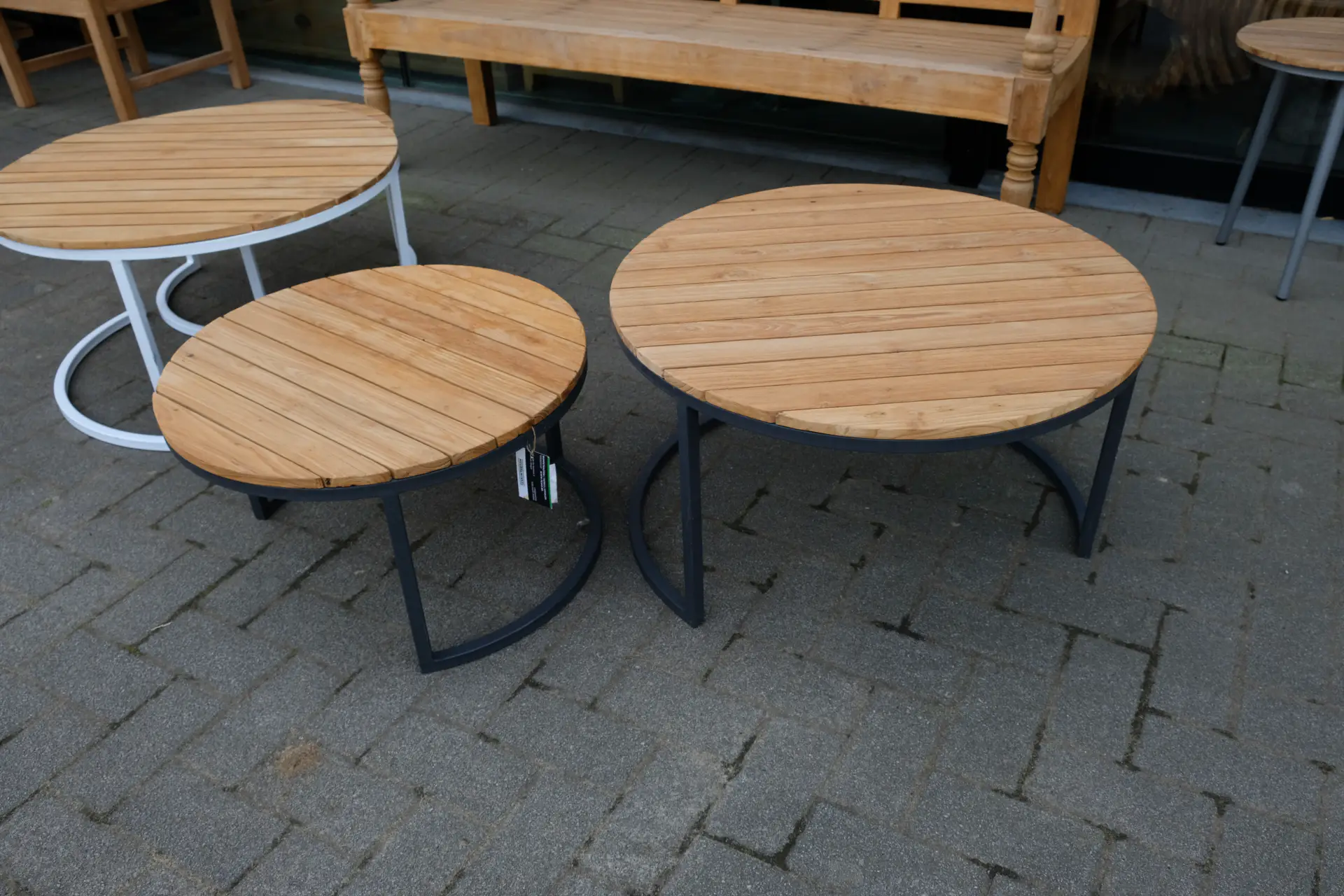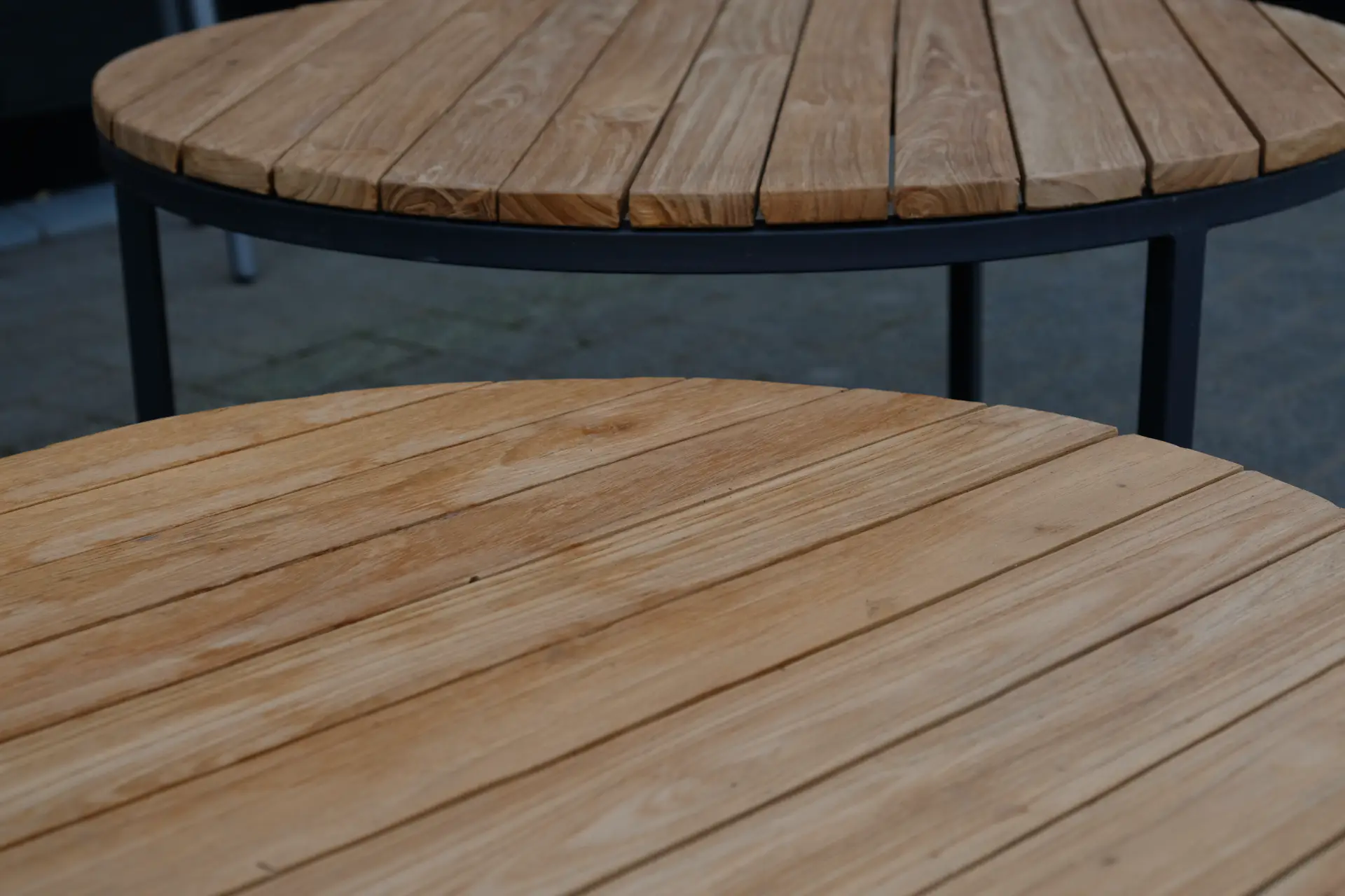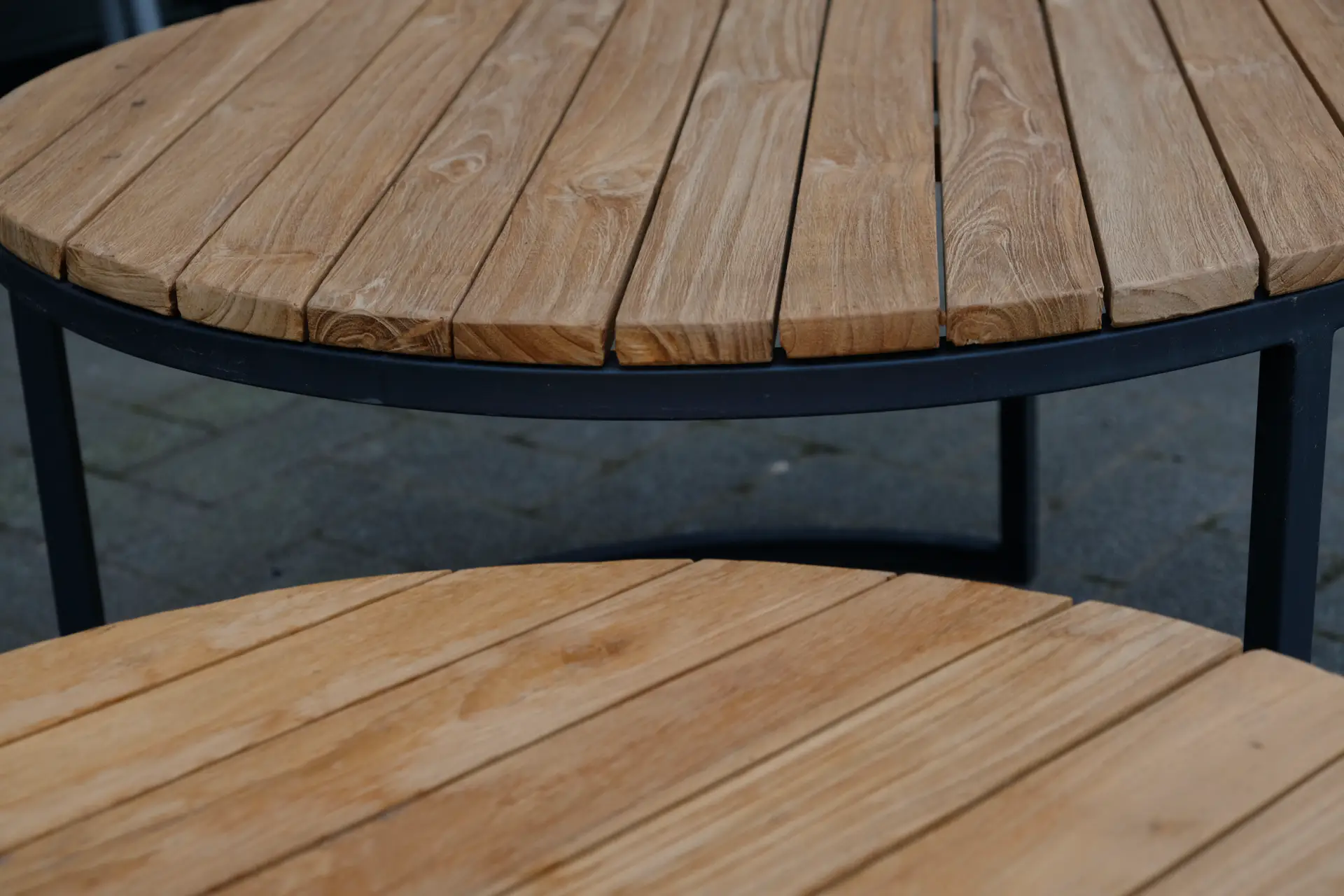 Deze ronde set bijzettafeltjes buiten heeft een moderne uitstraling en kan door de opbouw en constructie perfect dienen als buitenmeubel of teak tuinmeubel. Alle teakhouten tuinmeubelen en teak tuinmeubilair van TEAK2 voldoen aan de hoogste kwaliteit. De ronde bijzettafeltjes voor in de tuin kunnen o.a. dienen als bijzettafel tuin of ronde buiten salontafel voor binnen of buiten. Prijs is als set!