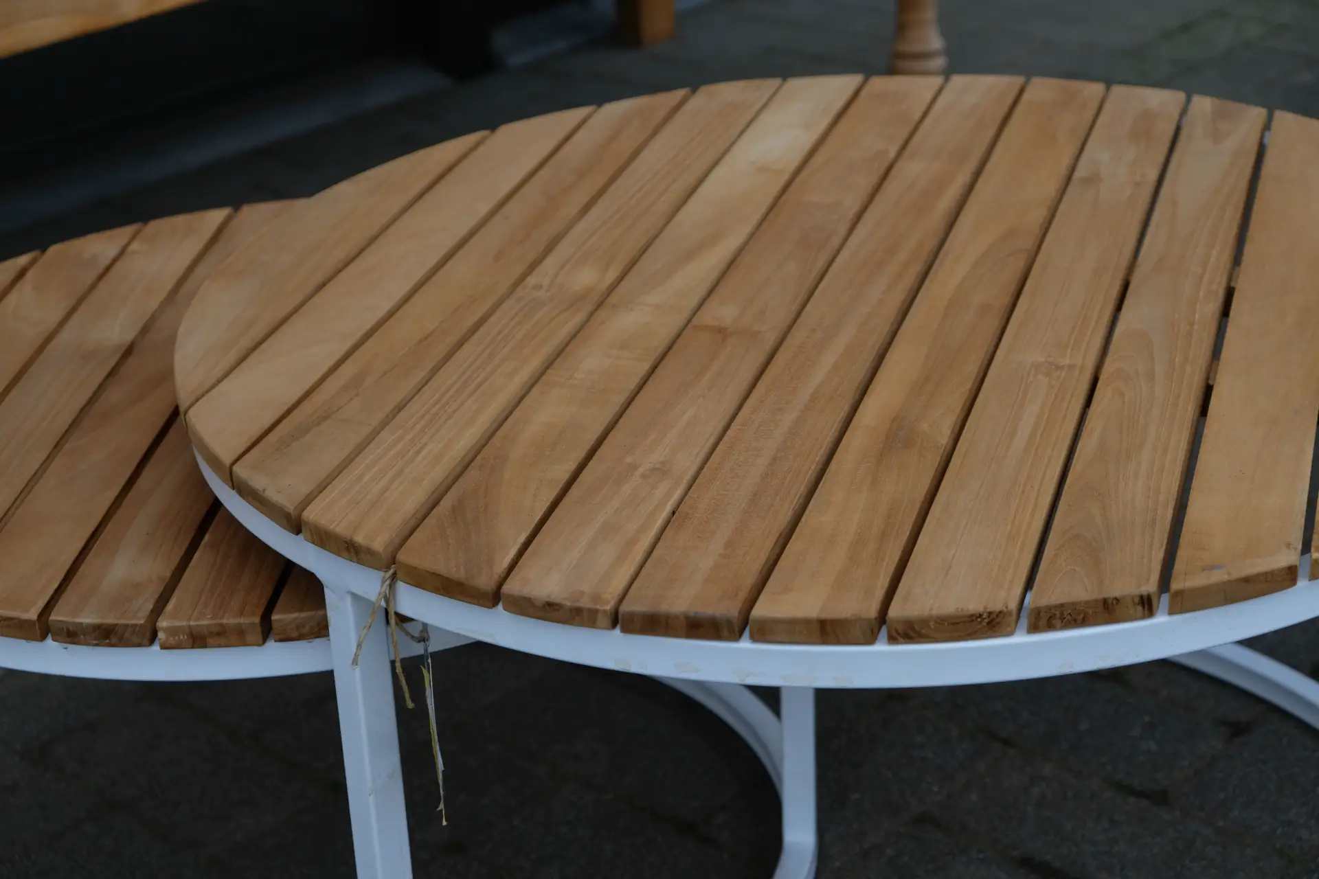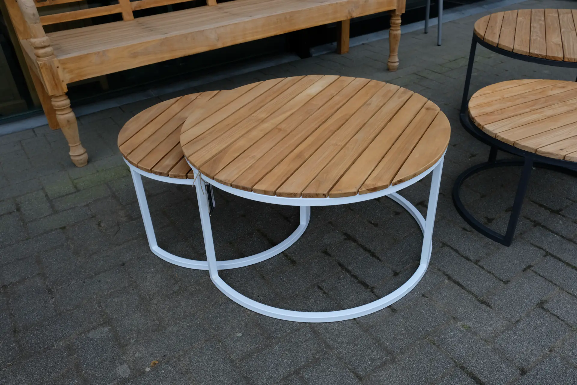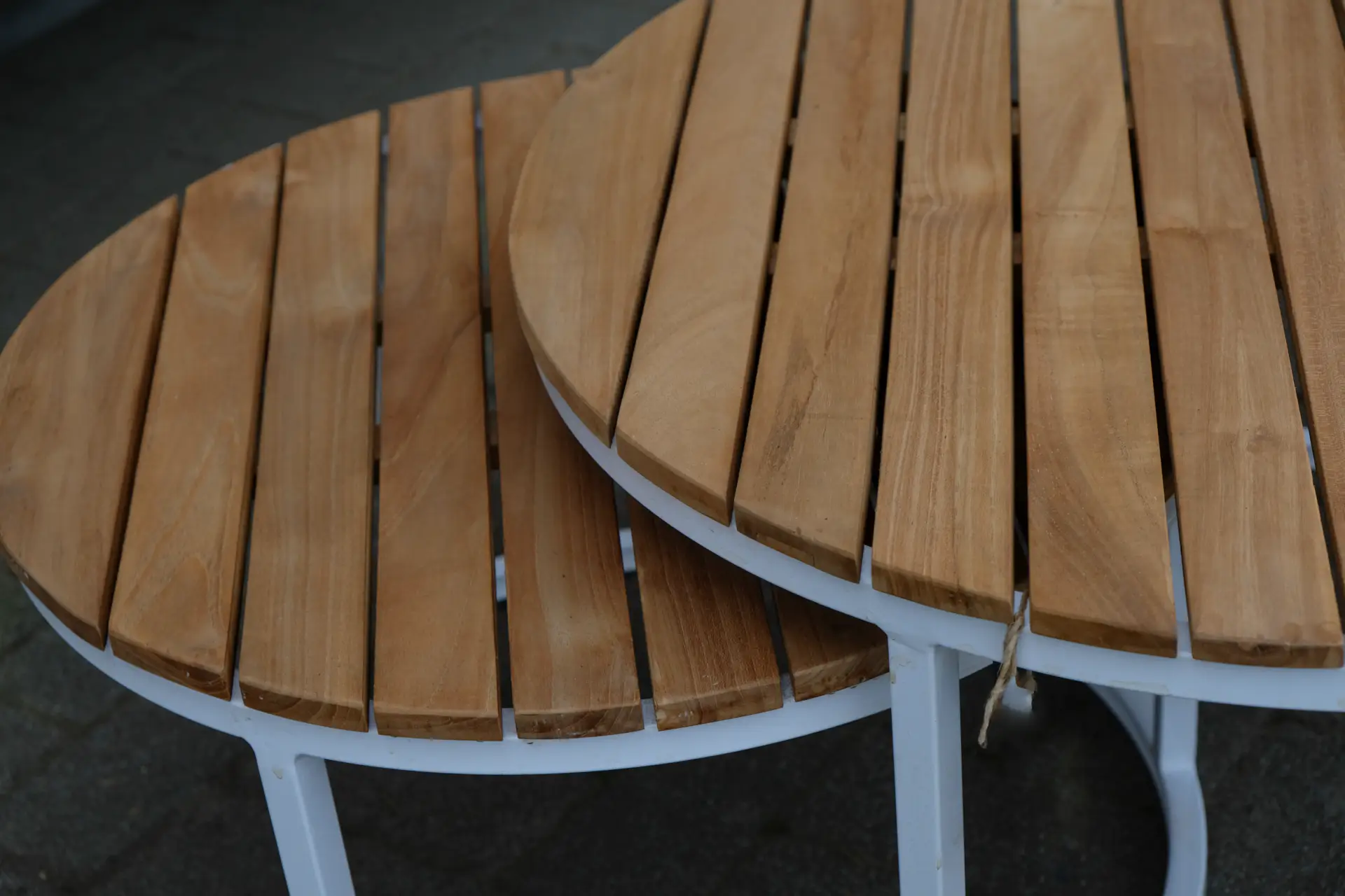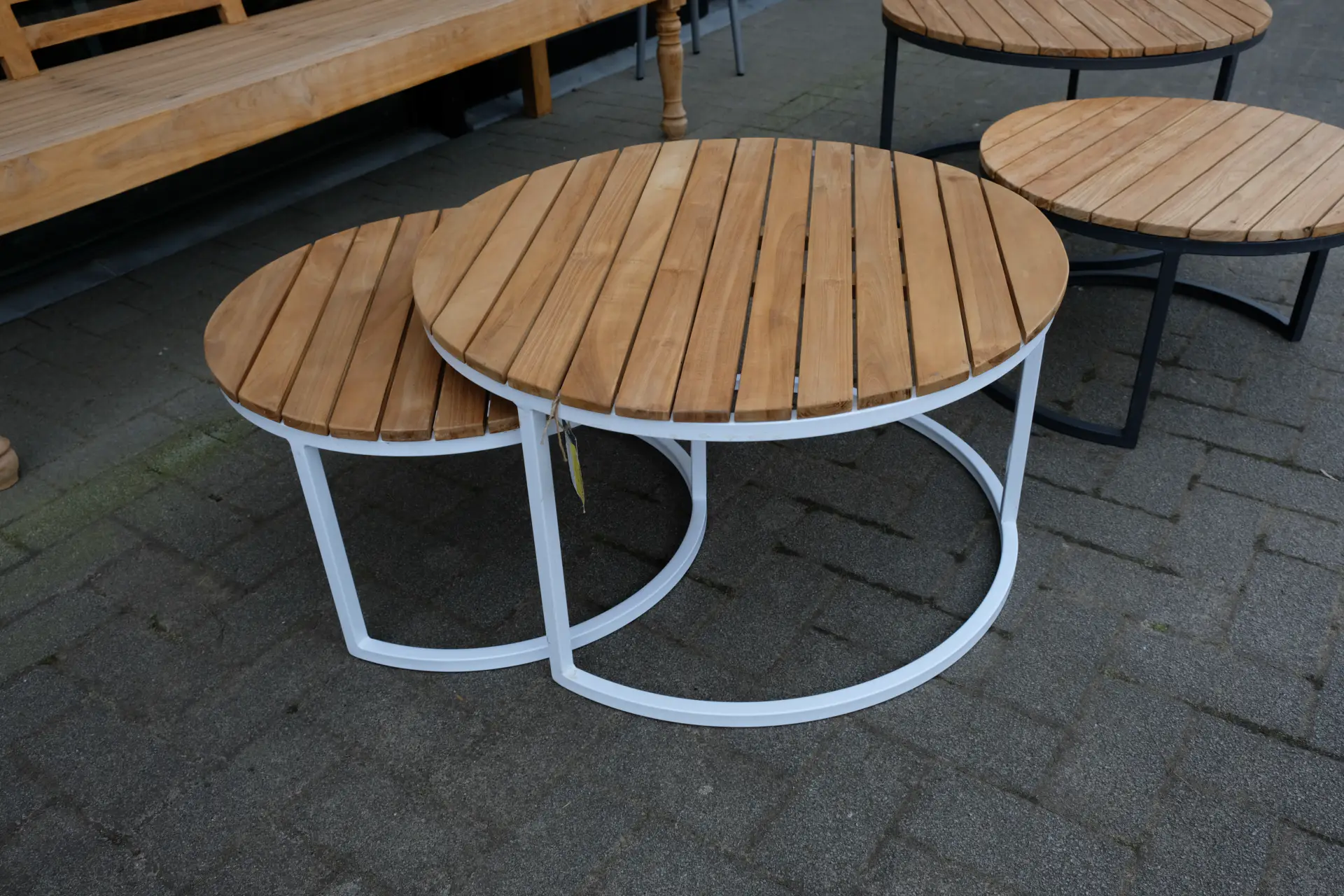 Deze ronde set bijzettafeltjes buiten heeft een moderne uitstraling en kan door de opbouw en constructie perfect dienen als buitenmeubel of teak tuinmeubel. Alle teakhouten tuinmeubelen en teak tuinmeubilair van TEAK2 voldoen aan de hoogste kwaliteit. De ronde bijzettafeltjes voor in de tuin kunnen o.a. dienen als bijzettafel tuin of ronde buiten salontafel voor binnen of buiten. Prijs is als set!