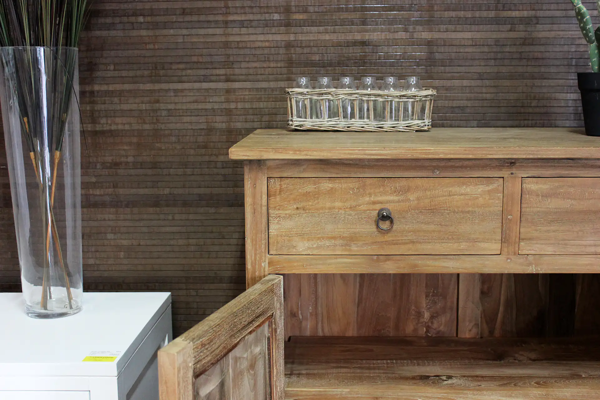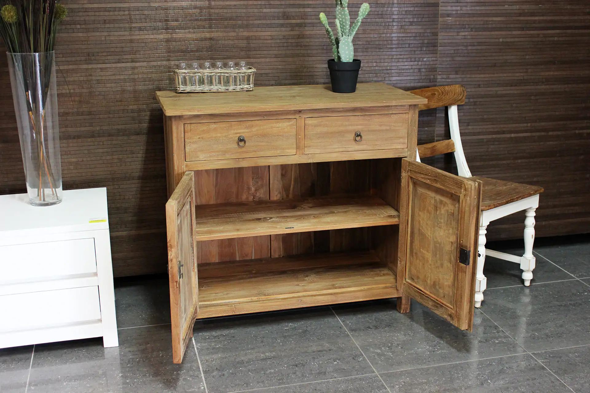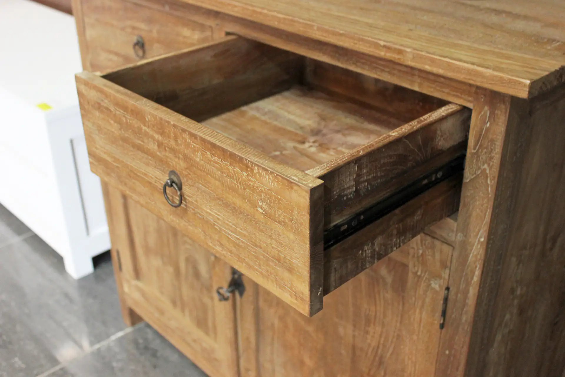Stijlvol teakhouten dressoir in prachtig oud teakhout. De Teak Rumah D100-200L Old is een teak dressoir met een landelijk moderne uitstraling. Dit dressoir is uitgevoerd met draaideuren en typeert zich door de moderne kenmerken en landelijke stijlelementen. De lades van het dressoir kunnen eenvoudig geopend en gesloten worden a.d.h.v. metalen ronde grepen. De onderkast staat op een strakke poot. Dit meubel bestaat uit 1 deel.