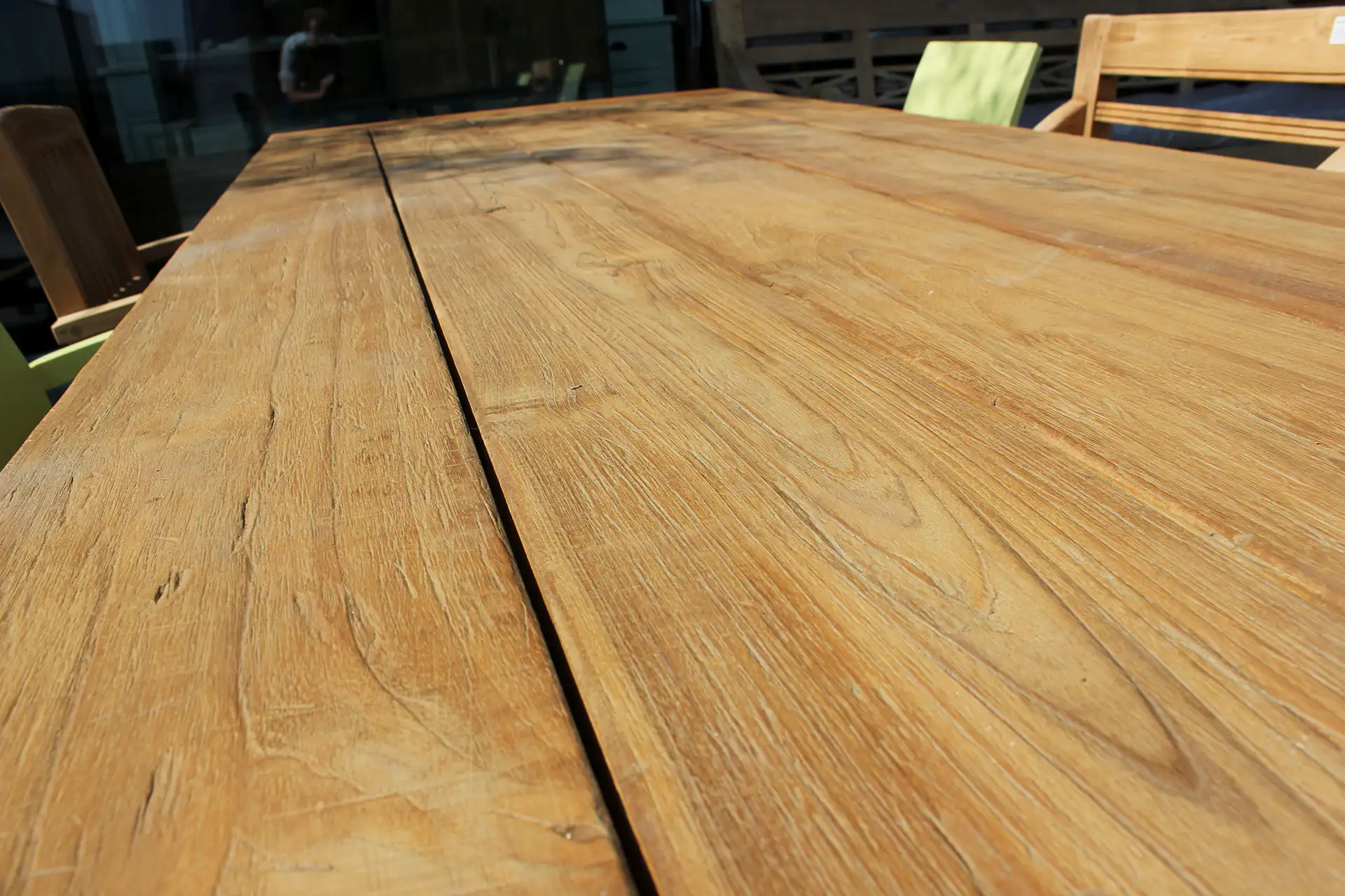 Massieve tuintafel hout met Trapezium poten. De Teak Tangguh O260KTL Old is een teak tuintafel met een landelijke uitstraling. Deze robuuste teakhouten tuintafel is uitgevoerd met een oud teakhouten blad (4cm) en heeft een kopregel. Deze massieve tuintafel hout typeert zich door de robuuste constructie met dikke poten in Trapezium-profiel. Het onderstel van deze teak tafel is een dikke teakhouten poot.